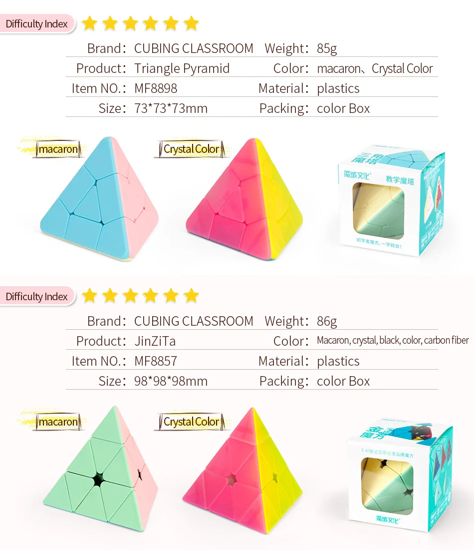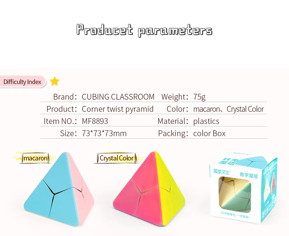 Product:Corner Twist Pyramid Color:Macrron、Crystal ColorItem Model: MF8893 Material:ABSSize:73*73*73mm Packing:Color BoxPackage Content: