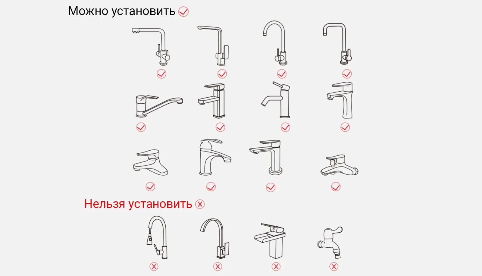 Высота резьбового соединителя продукта составляет 6 мм, поэтому за исключением случаев установки на кране со внутренней резьбой и диаметром 24 мм не допускается его использование с кранами, обладающими резьбовым соединением глубже 6 мм.