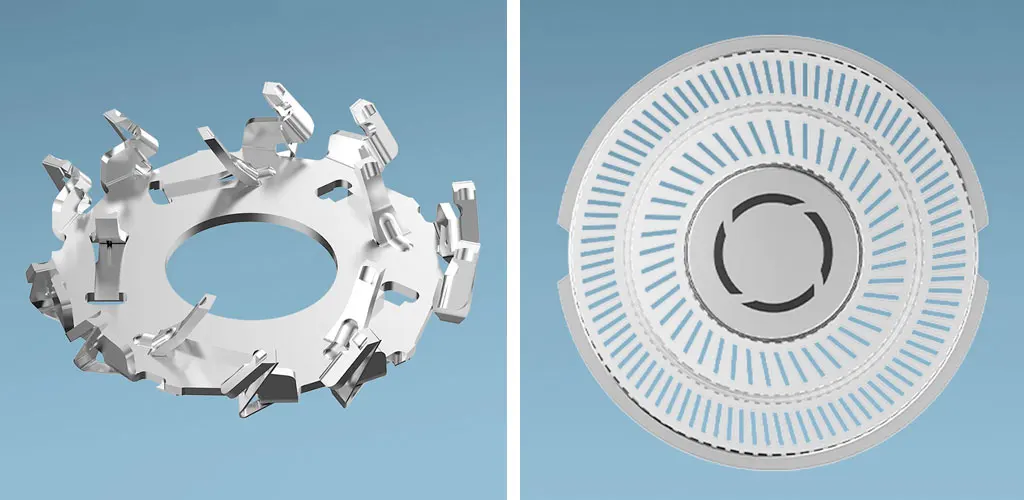 Бреющая сетка с двумя рабочими кольцами увеличивает площадь эффективного покрытия бритвы и захватывает почти на 50% больше волосков. Во внешнем кольце сделано ровно в два раза больше прорезей, чем во внутреннем, чтобы равномерно распределить нагрузку и обеспечить гладкое бритье за минимальное время, так что с утра не нужно торопиться в ванную.