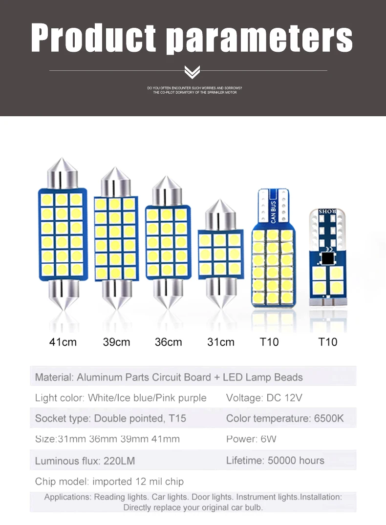 Подсветильник для карты (2 шт.) Купольный светильник (1 шт.) Светильник багажника (1 шт.) Светильник (2 шт.) Светильник номерного знака (2 шт.) Светильник (2 шт.) Тип интерфейса: T10(W5W/194)/Festoon-31mm/Festoon-36mm/Festoon-39mm/Festoon-41mm Световой поток: керамический T10 (312Lm/колба); Напряжение: 12 В Мощность: керамическая Т10 (3 Вт/9 Вт); Тип светодиодного чипа: 5630/4014 Цвет: белый (6000K) Материал корпуса: алюминий/керамика Особенность: 1. Светодиодная гирлянда: бесконтактная конструкция CAN-bus (без предупреждающих сообщений на приборной панели, без мерцания/без подсветки), неполярность, подключи и работай. 3. Клиновидная светодиодный ная лампа имеет Полярную чувствительность, поэтому в случае, если лампа не светильник, пожалуйста, переверните ее на 180 градусов. (светодиодный ная лампа имеет полярность как батарея)