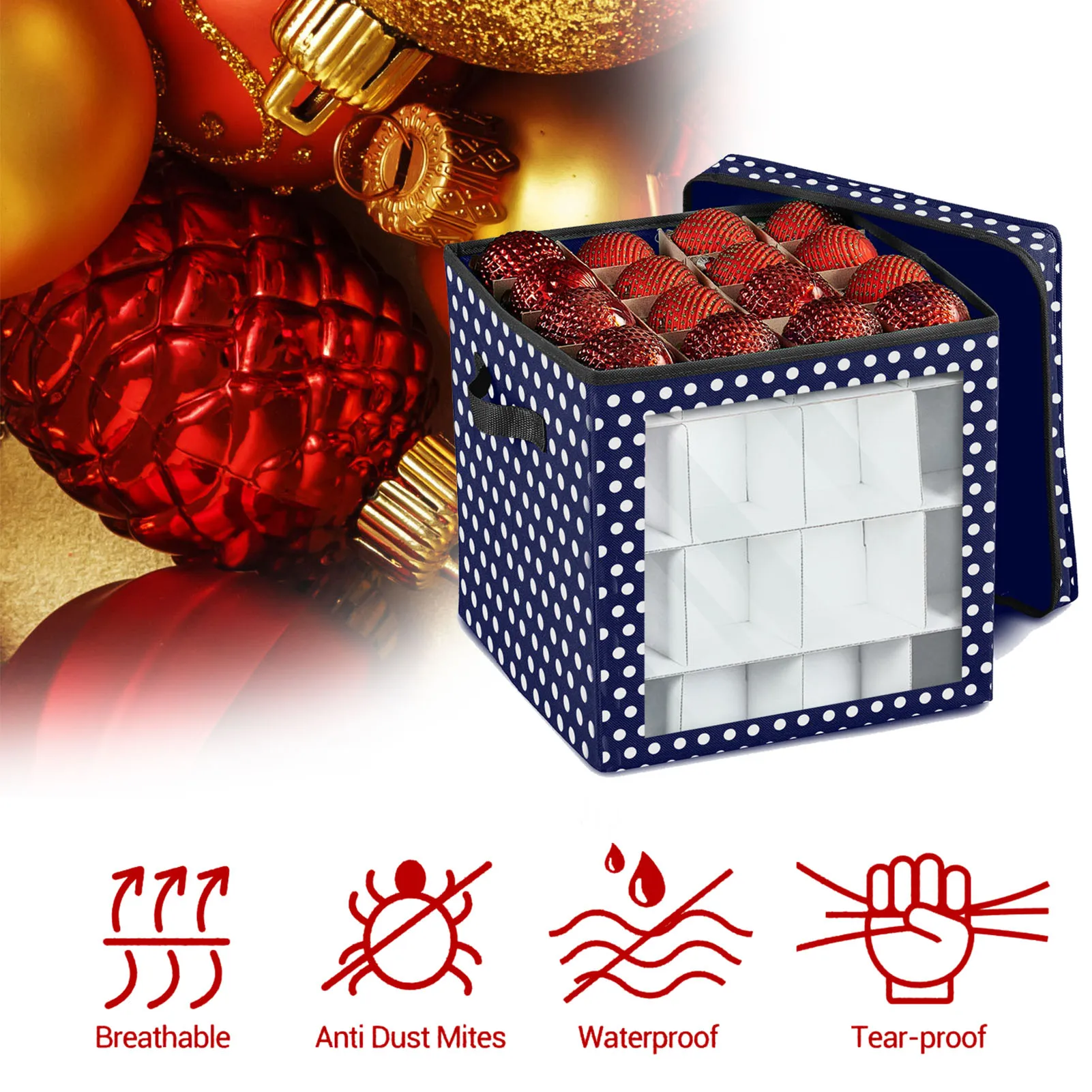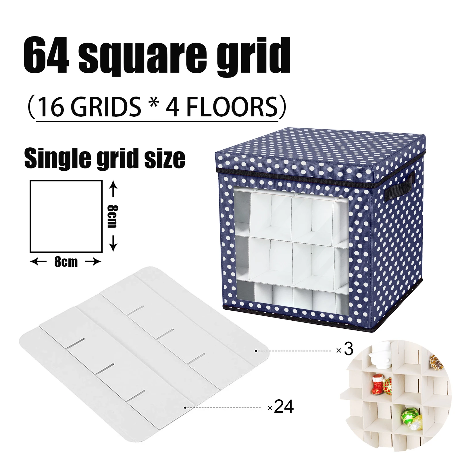 1. Хранение орнаментов: 64 сеточки. С картонными перегородками для защиты украшений от царапин и излома, подходит для рождества, Пасхи, Хэллоуина и других особых случаев.1 * коробка для хранения рождественских украшений