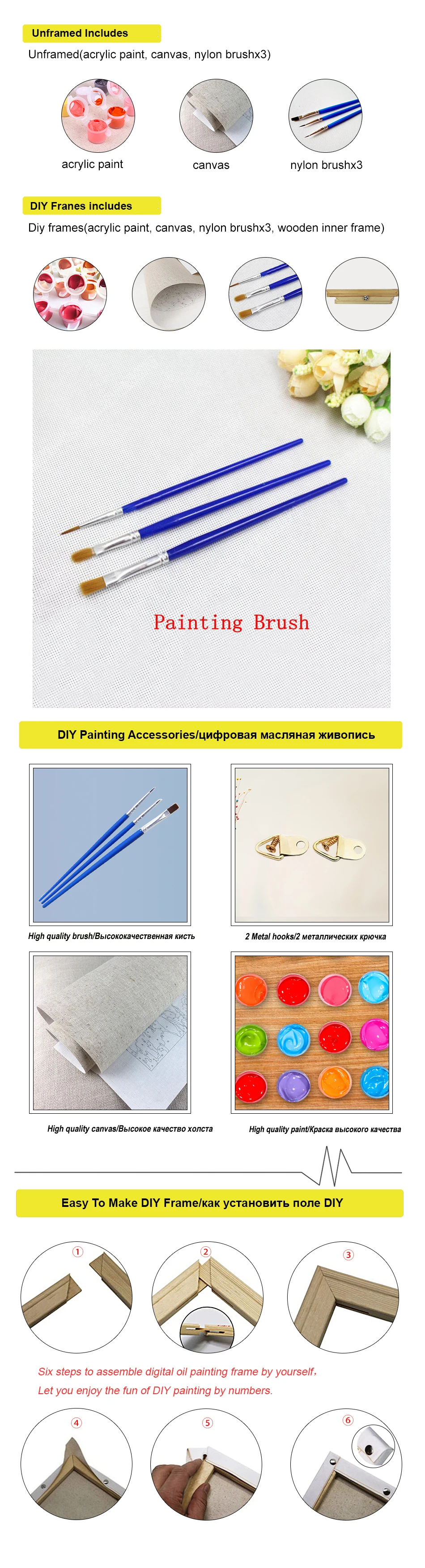 Посылка включает в себя:Без рамки (акриловая краска, лен (для рисования), нейлоновая кисть x3, карта, бумага (для справки)