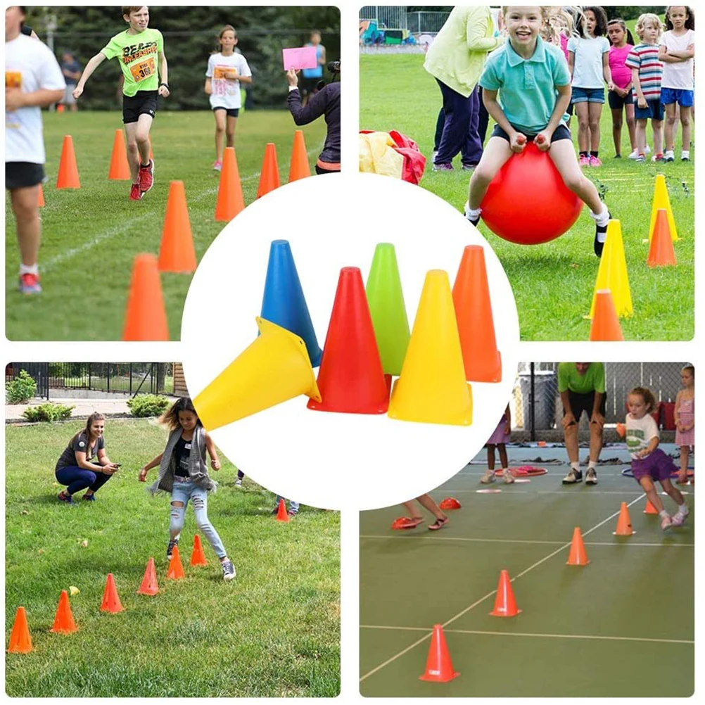 То, что вы получите-наш набор спортивных дней 3 в 1 включает 6 безопасных мягких конусов, 10 случайных цветных мешков для бобов и 10 случайных цветных колец, подходит для многокомандных теплых игр, а также для игр в домашний сад и т. д.