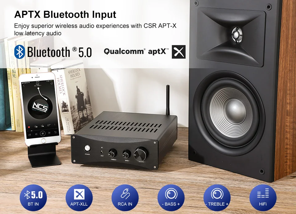 Метод работы: Класс D Чип усилителя: TPA3255 Версия Bluetooth: QCC3008 Bluetooth 5,0, Поддержка APTX Рабочее напряжение: AC220V/AC110V (опционально) Общая выходная мощность, когда общее гармоническое искажение + шум (THD + N) составляет 1% (240 Вт/4Ω)* 2 Общая выходная мощность, когда общее гармоническое искажение + шум (THD + N) составляет 10% (325 Вт/4Ω)* 2 Размер: 240*190*65 мм, Длина антенны 105 мм