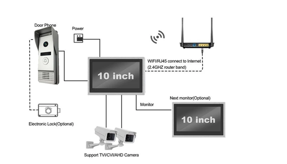 10 дюймов TFT сенсорный экран для контроля уровня сахара в крови с простой операционной системы и расширенные функции, в результате чего 4 канала Дисплей. С новейшей технологией IP, когда кто-то нажимает дверной звонок, вы получите уведомление приложения с вашего телефона, затем вы можете увидеть или поговорить с кем-либо у вашей двери, или даже Удаленная разблокировка через ваш смартфон во всем мире.