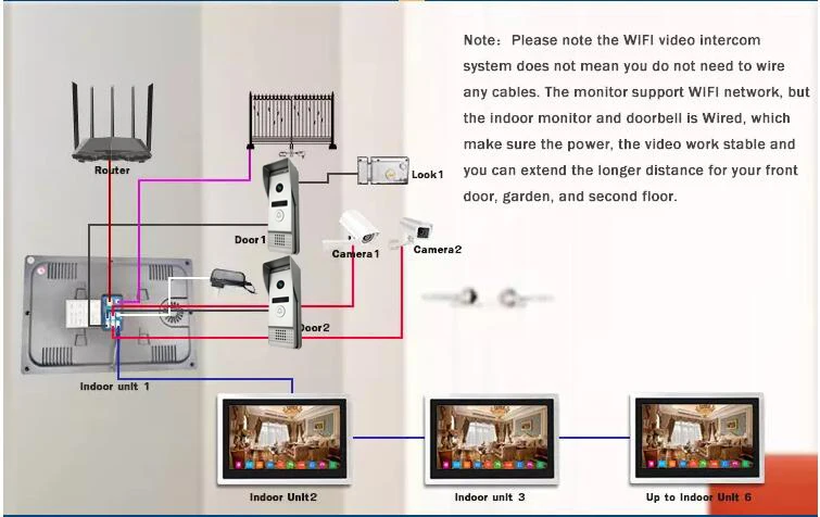 Монитор поддерживает сеть Wi-Fi, но внутренний монитор и дверной звонок проводной, что гарантирует питание, видео работает стабильно, и вы можете увеличить расстояние. Обратите внимание, что система видеодомофона Wi-Fi не означает, что вам не нужно подключать кабели. Монитор поддерживает сеть Wi-Fi, но он подключен к дверному звонку для обеспечения источника питания и стабильного видео и голосового сигнала. Поддержка мобильных систем Android и ISO.