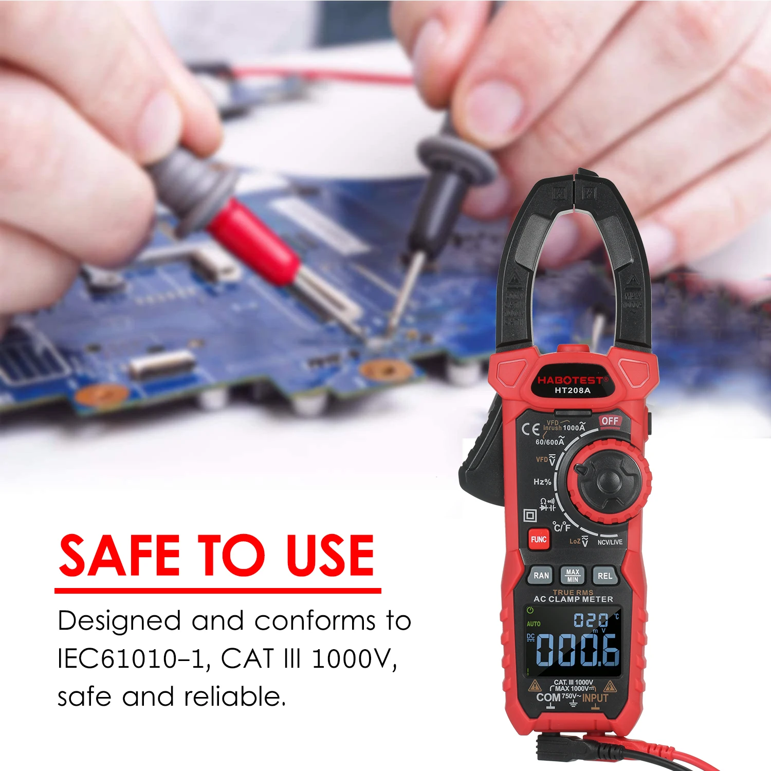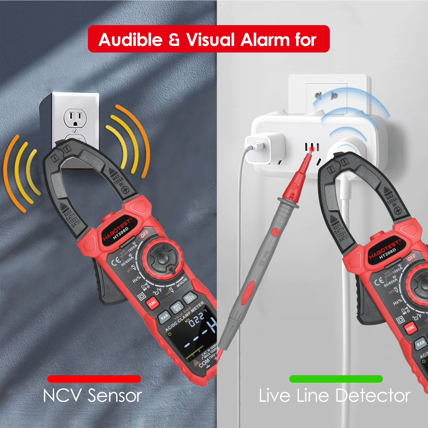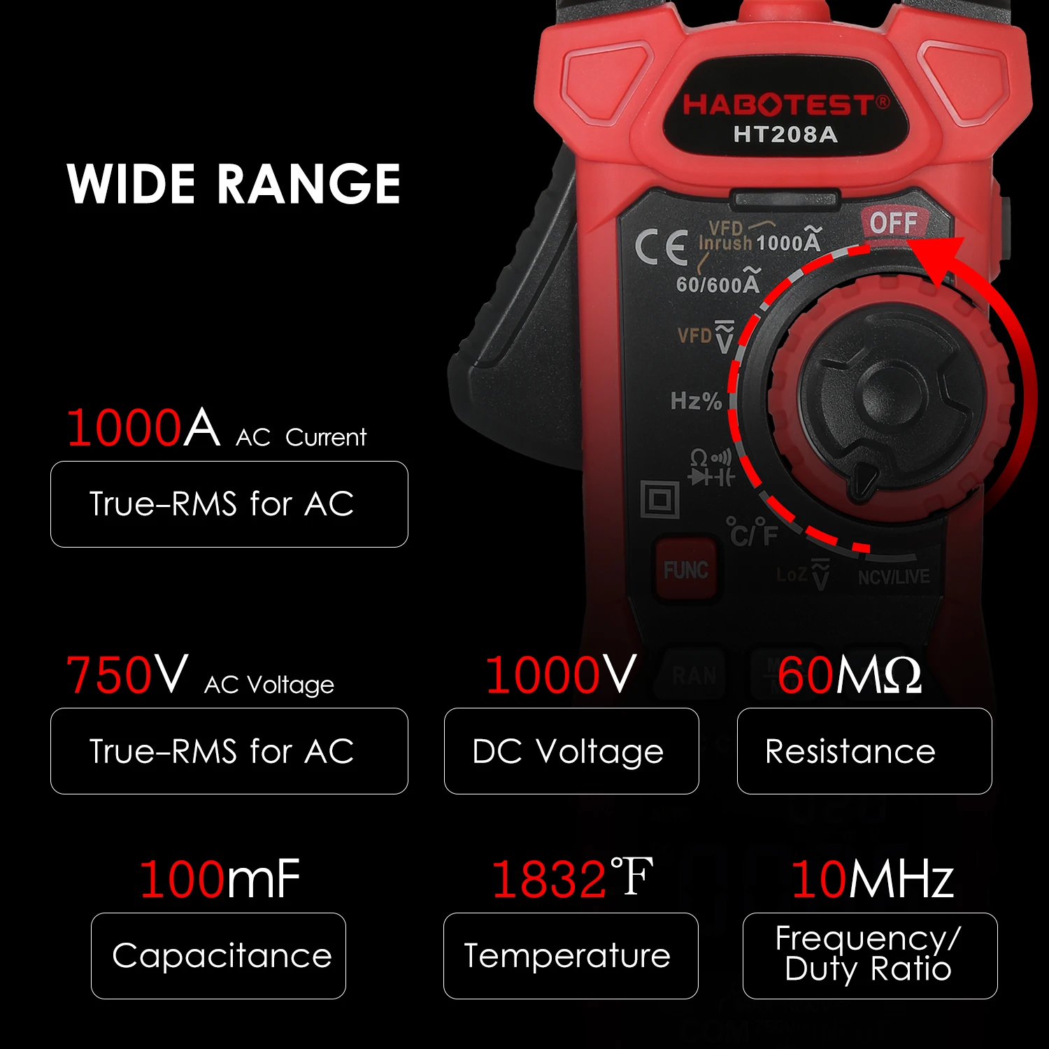 Мультиметр с зажимом: измеряет входной ток, ток/напряжение VFD, ток переменного/постоянного тока, напряжение переменного/постоянного тока, частоту, коэффициент работы, сопротивление, непрерывность, диод, емкость, температуру, бесконтактное Обнаружение напряжения переменного тока (NCV) и обнаружение в режиме реального времени.