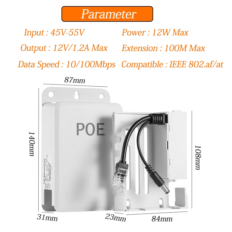 Кабель-Сплиттер Poe-это устройство, предназначенное для ip-камеры, которое соответствует стандарту 802,3 afEthernet питания. Поддержка Poe IEEE 802.3af совместимое с питанием устройство (PD). Выход 12 В, максимальная мощность 12 Вт. Он имеет функции защиты от короткого замыкания (восстанавливается для работы после выхода короткого замыкания), Защита от перегрузки по току (восстанавливается для работы после выхода перегрузки по току). Процесс упрощения инженерной установки с помощью проектирования водонепроницаемой коробки.