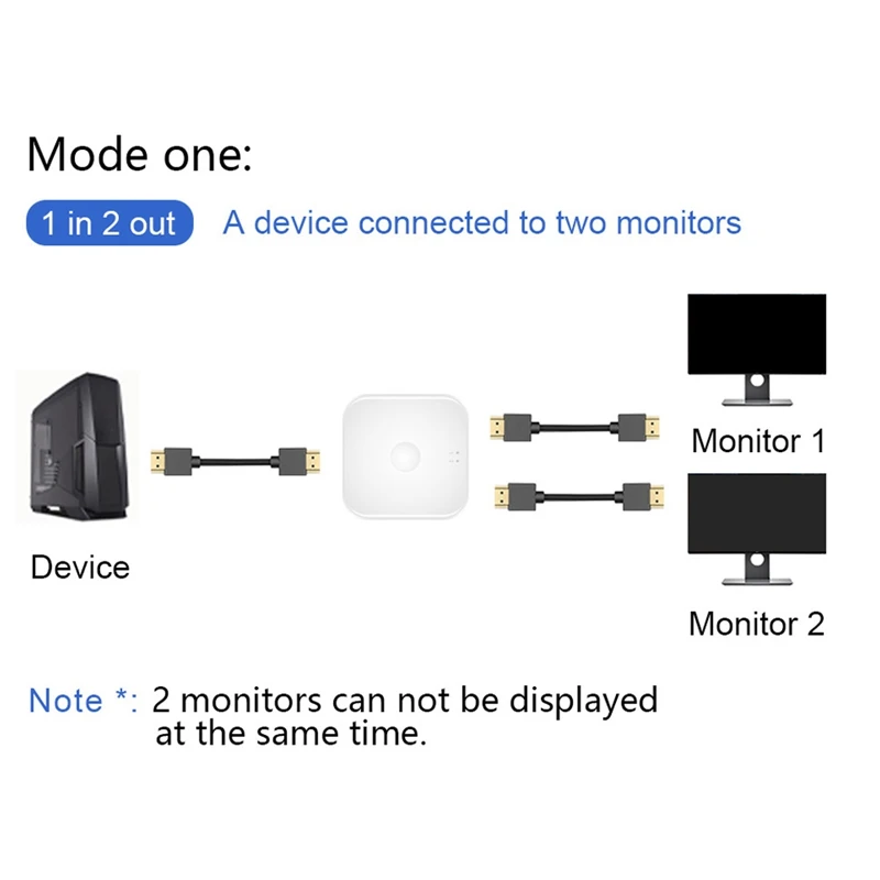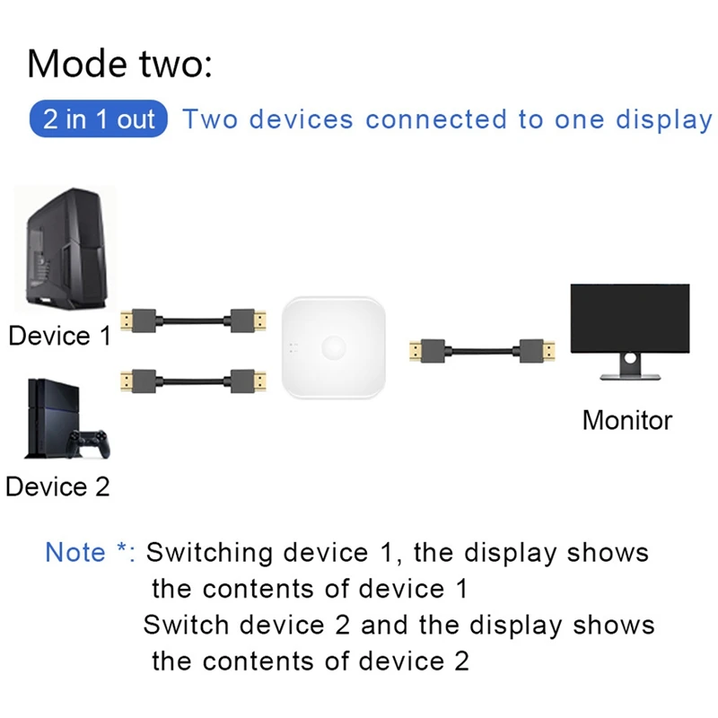 Двунаправленный HDMI переключатель: HDMI переключатель может работать двунаправленным образом, помогает подключить два источника HDMI к одному дисплею HDMI или подключить один источник HDMI для переключения между двумя дисплеями (2 монитора не могут отображаться одновременно).