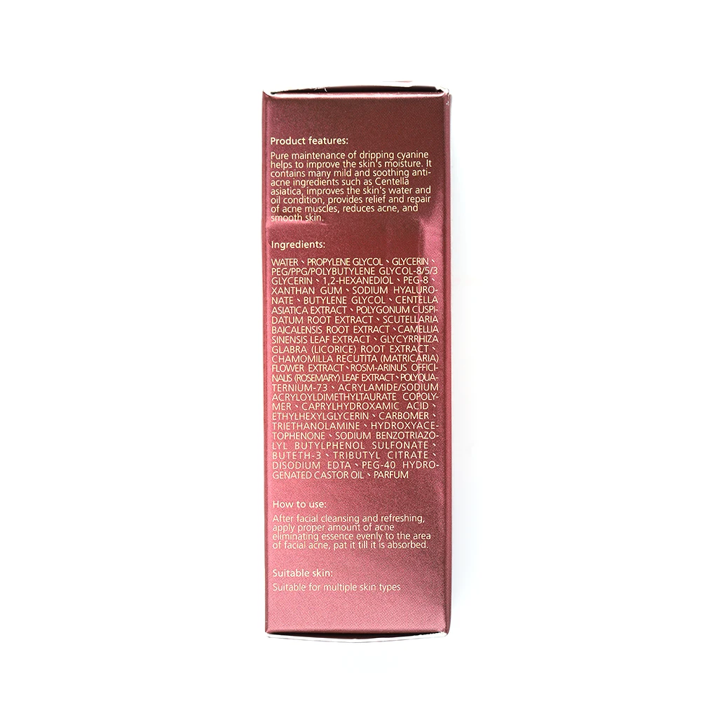 Название: сыворотка для удаления акне Нетто: 10 мл ▼ Особенности продукта: Чистое содержание капающего цианина помогает улучшить влагу кожи. Содержит много мягких и успокаивающих антиакне ингредиентов, таких как центелла asiatica, улучшает состояние воды и масла кожи, обеспечивает облегчение и восстановление мышц акне, уменьшает акне и гладкую кожу. ▼ Инструкции по использованию: После очищения лица и освежения нанесите необходимое количество акне, равномерно удаляя эссенцию на область акне для лица, погладьте ее до впитывания.