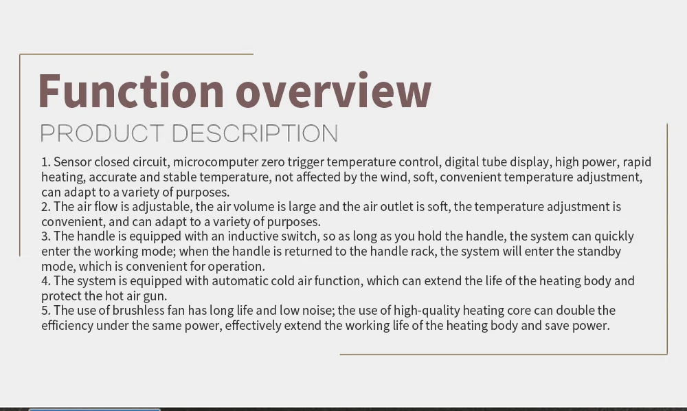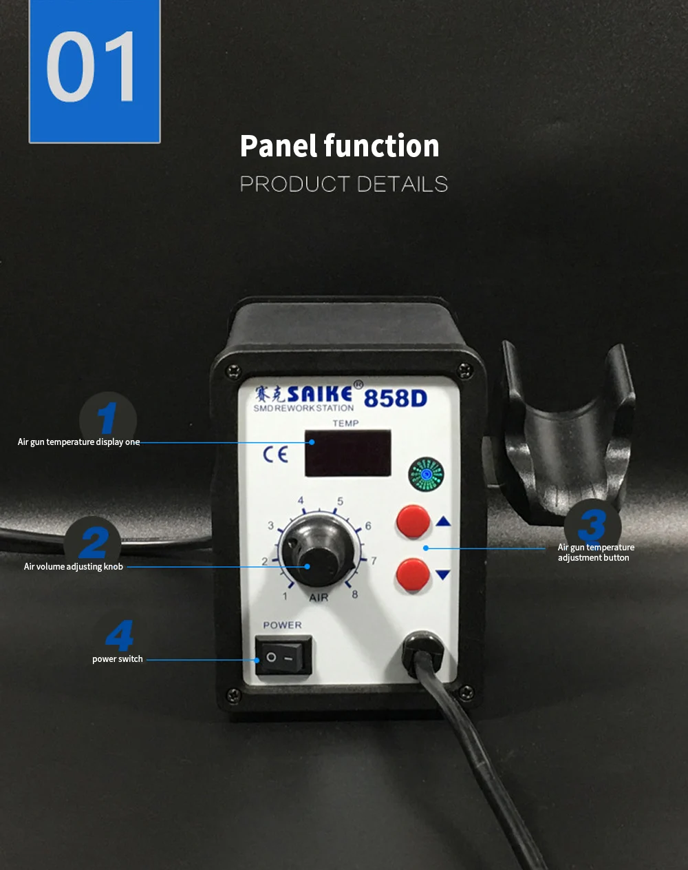 Технические характеристики Модель: 858D Потребляемая мощность: ≤ 700 Вт Размер: 150*100*135 мм Рабочая среда: 0-40 ° C / 32- 104F Среда хранения:-20 ~ 80 ° C / -4 ~ 176F Температура хранения: 35%-45% Секция воздушного пистолета Тип воздушного потока: Бесщеточный вентилятор Поток ветра: ≤ 120 л/мин Диапазон температур: 100-500 ° Нагревательный элемент: керамический нагревательный элемент скелета Форма дисплея: светодиодный цифровой (разрешение 1 ° C) Длина ручки: 100 100 см Шум: ≤ 45 dbтехнические характеристики