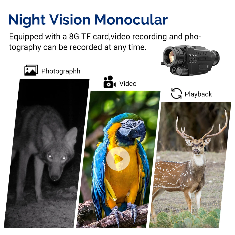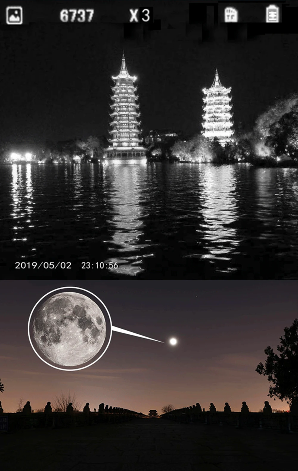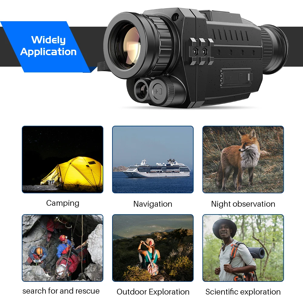 * С usb-портом и портом передачи видео. Быстрая и простая передача данных с помощью usb-кабеля, просмотр изображений и видео на мониторе с отключением видео и подзарядкой аккумулятора с помощью разъема постоянного тока. Монокуляр может использоваться для съемки фотографий или видеосъемки днем или ночью.