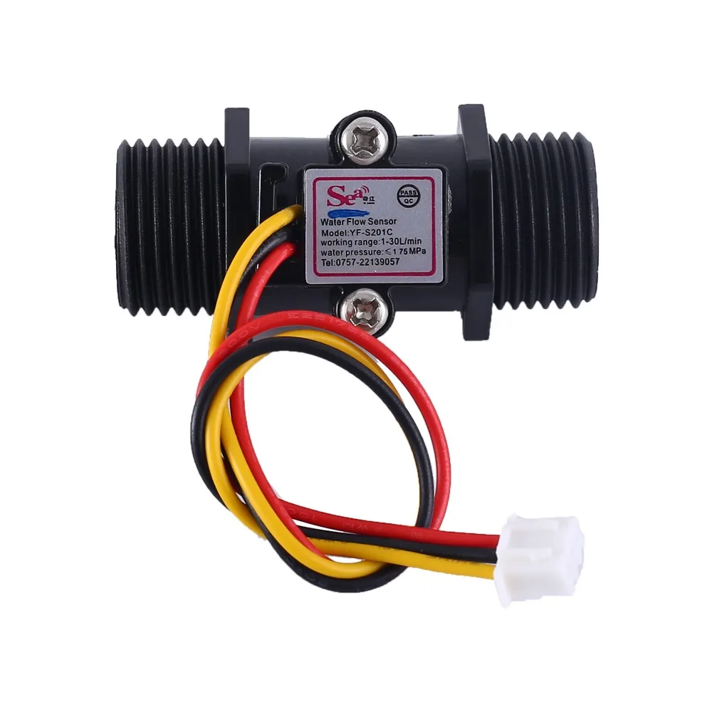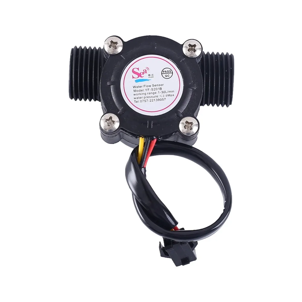 1. Описание: Это расходомер для измерения расхода воды. 2. Особенности: 1>. Высокая точность 2>. Высокое сопротивление давлению 3>. Стандартный Размер 3. Параметры: 1>. Модель: YF-S201B DN15 2>. Спецификация: G1/2 3>. Рабочее напряжение: 5 В ~ 24 В постоянного тока 4> Рабочий ток: 15 мА 5>. Характеристика импульсного потока: F = 5 * Q;Q = L/min 6>. Точность: 3% 7>. Выходной ток:<10 мА 8>. Диапазон потока: 1-30 л/мин 9>. Окружающая среда давления воды:<2MPa 10>. Рабочая температура: 0 ℃ ~ 80 ℃ 11>. Рабочая влажность: 5% ~ 90% относительной влажности 12>. Размер: 59*36*36 мм 13>. Длина провода: 150 мм 4. Функция: 1>. Рассчитать поток через датчик жидкости, получив выходную частоту от датчика. 5. Определение штифта: 1>. Красный провод: VCC. Он используется для подключения к положительному входному напряжению работы. 2>. Желтый провод: выход сигнала. 3>. Черный провод: GND. Используется для подключения к отрицательному входному напряжению. 6. Посылка: 1>.1 шт. YF-S201B G1/2 Датчик расхода воды