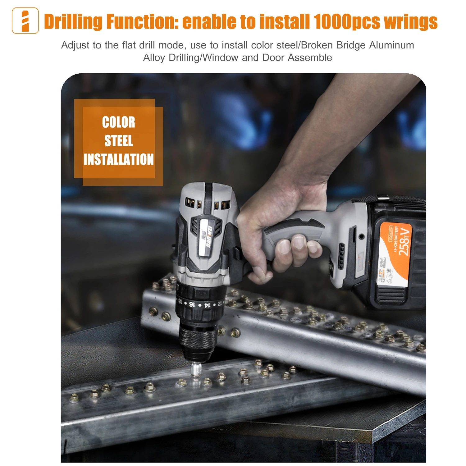 Аккумуляторная дрель промышленного класса с бесщеточным двигателем может обеспечить ударную мощность до 2655 нм (инф), что в 10 раз больше, чем у большинства дрелей на рынке. 2-скоростная дрель с 23 позициями сцепления для плоской дрели/отжима Kai/удара, переменная скорость, контролируемая различной силой нажатия, подходит для установки из цветной стали, сверления металла, открытие 100 мм большое отверстие для дерева и т. Д.