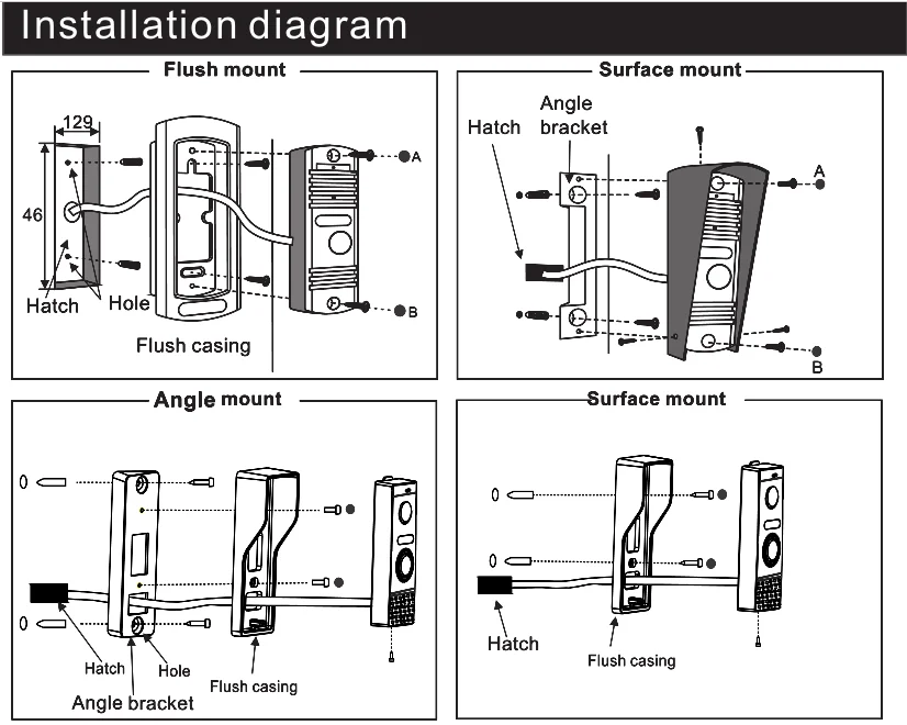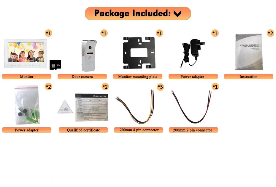 Наружная панель вызова Спецификация: Камера: CMOS Угол обзора: широкий угол 130 ° Определение (Hor.) 1200TVL Светодиоды для ночи: ИК-светодиоды Потребляемая мощность: 200 мА макс. (10-13 В постоянного тока) Поставщик энергии: поставляется из внутреннего блока Рабочая температура. : -40 ~ + 50 °C Установка: поверхностное/смывное крепление Характеристики внутреннего монитора: Экран дисплея: 7'' Стандарт: PAL Режим вызова: двусторонний разговор Время вызова: ≧ 120S Ток в режиме ожидания: максимум 250 мА Рабочий ток: максимум 600 мА Источник питания: внешний импульсный источник питания (DC12V) Рабочая температура: 0 ~ + 50 °C Способ установки: поверхностное крепление Максимальная емкость SD: 32 Гб (не входит в комплект) Входной видеосигнал: CVBS