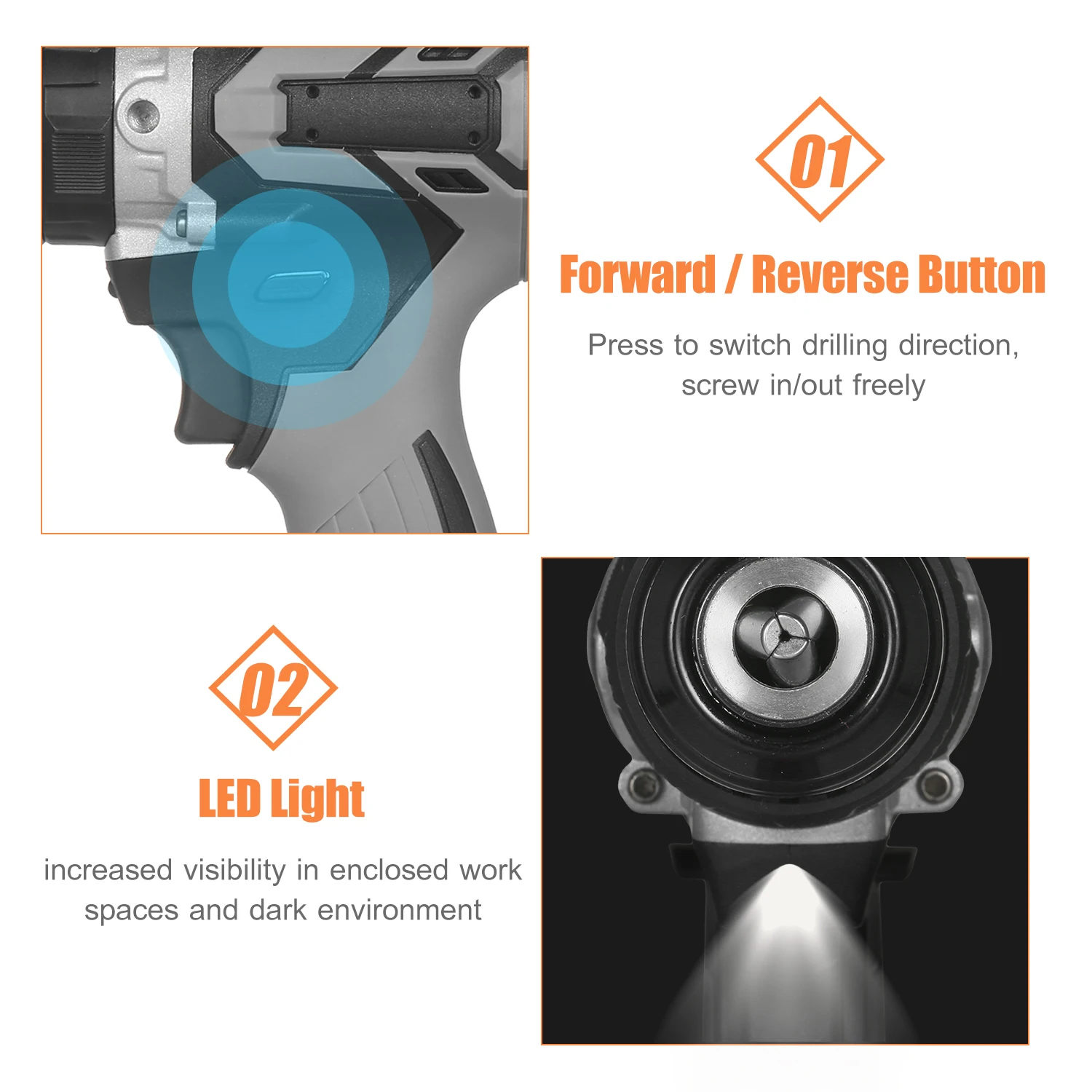 1/2in цельнометаллический БЕСКЛЮЧЕВОЙ патрон и светодиодный рабочий светильник-по сравнению с 3/8in пластиковым патроном, 1/2 дюйма Автоматическая блокировка бесключевого металлического зажимного патрона является более стабильной и не отпадает и обеспечивает максимальную совместимость и долговечность аксессуаров. Светодиодный светильник, активированный триггером, для увеличения видимости в закрытых рабочих помещениях и в темной среде.