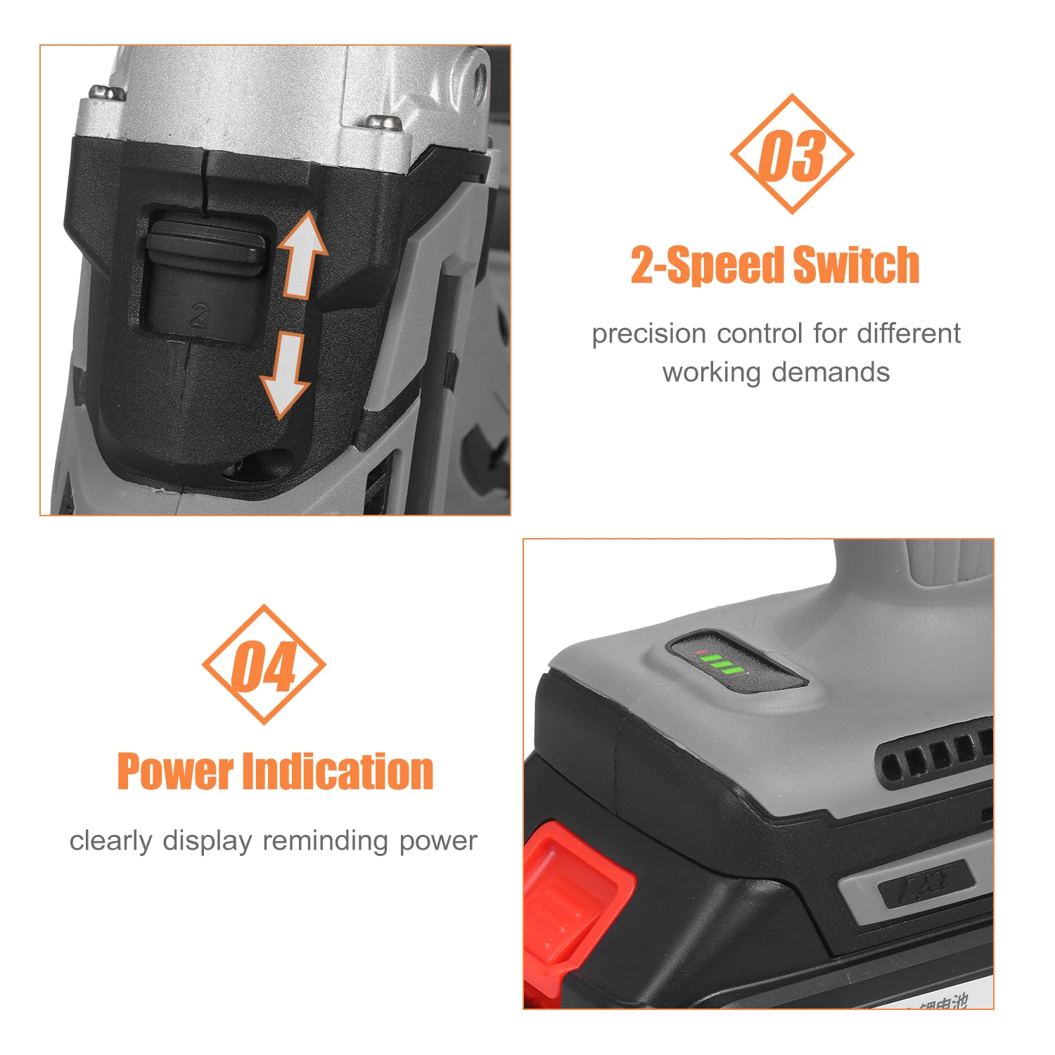 21V 6.0A Максимальная батарея-1 упаковка/2 комплекта опционально. Литиевая батарея большой емкости 21V max 6000mAh достаточно мощна, чтобы держать дрель постоянно работает в течение 10 часов, когда не загружается. Индикатор на передней части ударной дрели отображает, сколько энергии осталось для меньшего времени простоя на работе.