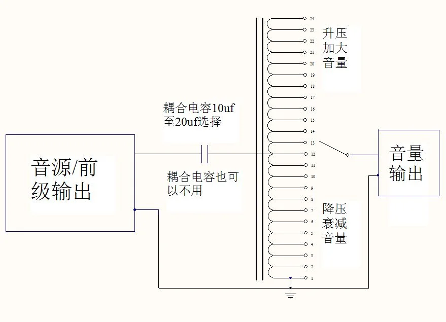Этот полночастотный трансформатор является автотрансформатором. Первичная катушка и вторичная катушка имеют один и тот же провод заземления. Сигналы первичной катушки и вторичной катушки подключены, а ширина частотной реакции практически не зависит от трансформатора. Сигнал (громкость) имеет 24 уровня регулировки на протяжении всего хода от маленького до большого.