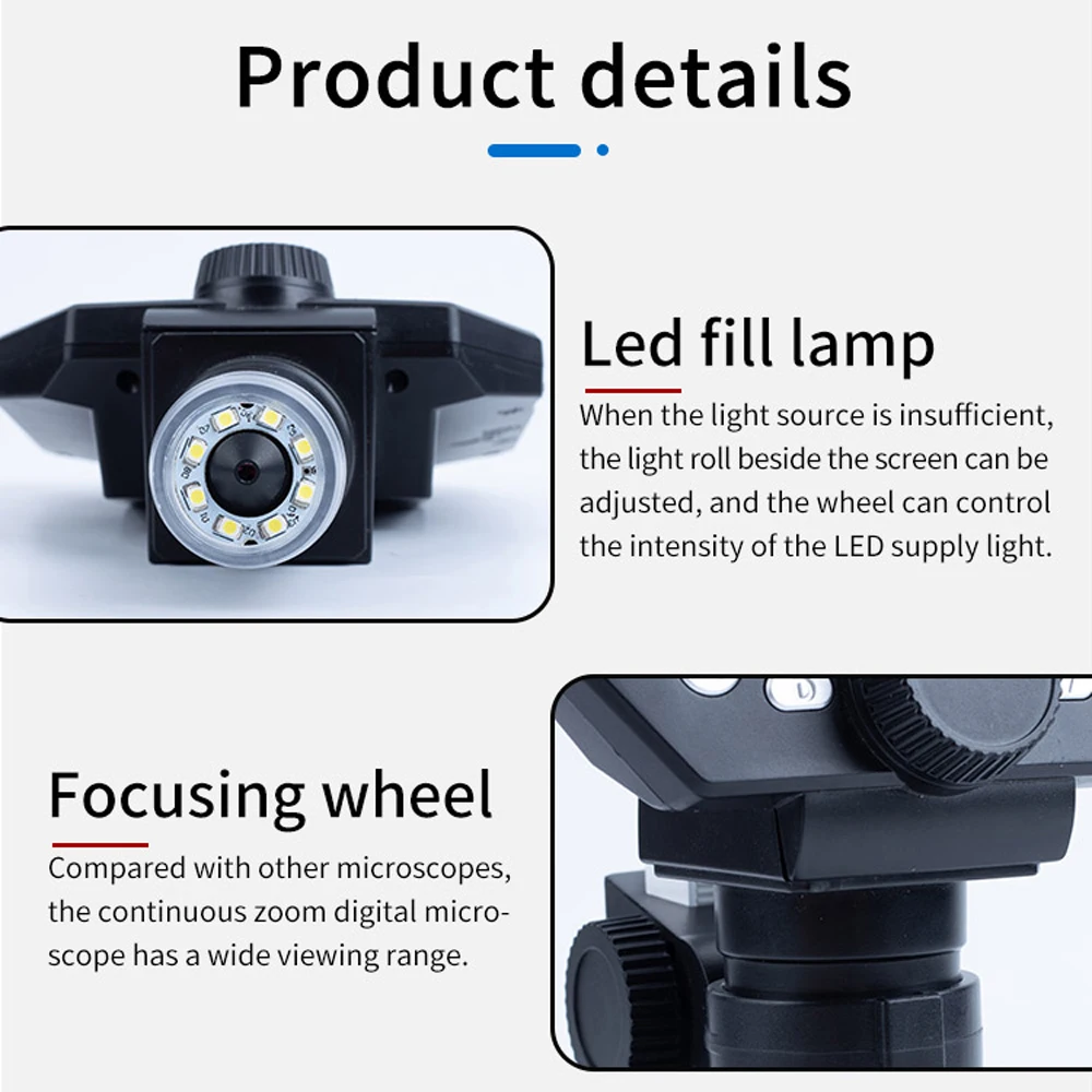 4,3-дюймовый высокой четкости ЖК-дисплей экран G1000 микроскоп, кронштейн может быть поворачивается в соответствии с вашими требованиями, в то время как объектив поддерживает 1-1000X с непрерывным масштабированием. Это определенно может быть прекрасным помощником для вашей повседневной работы.