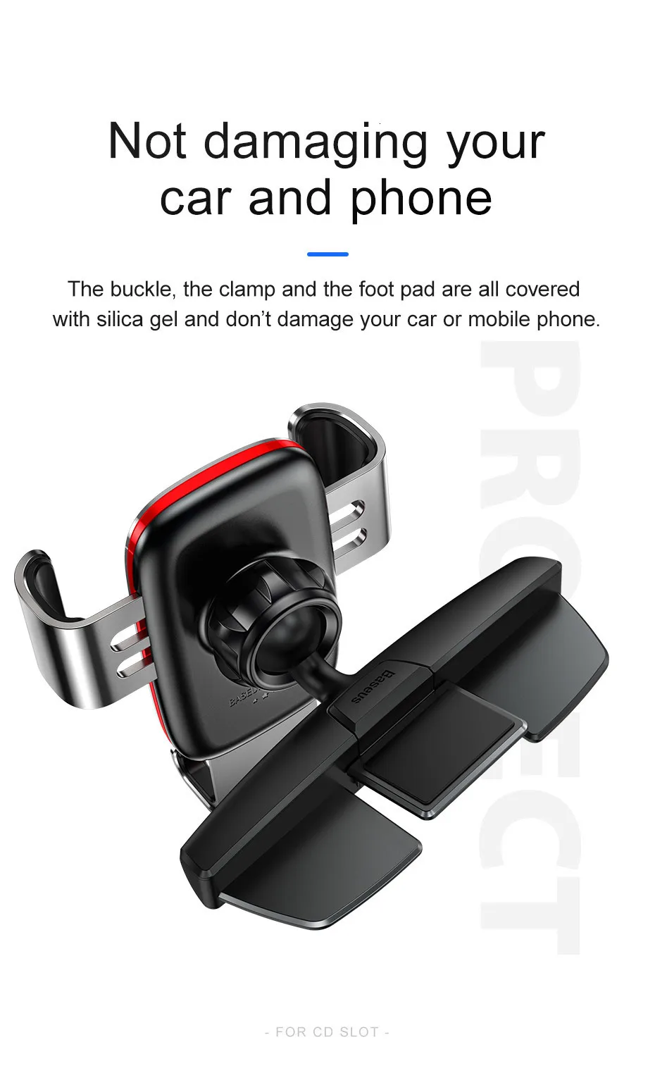 Пряжка, зажим и ножная накладка покрыты силикагелем и не повреждают ваш автомобиль или мобильный телефон.