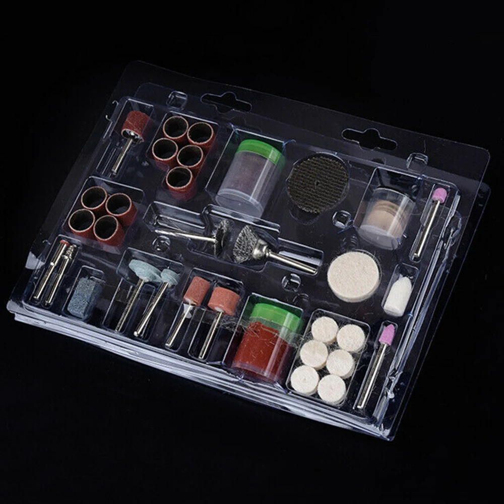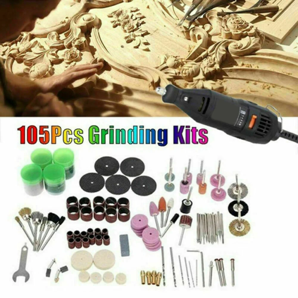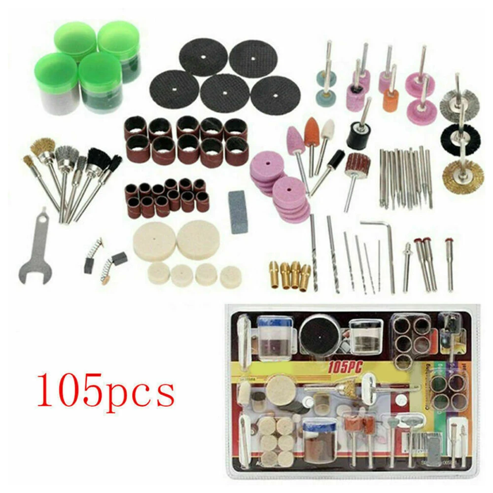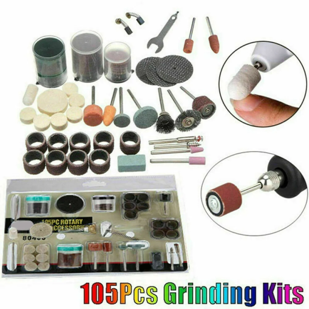 * Этот набор включает в себя 105 шт. набор из следующих элементов: полировальные инструменты, колодки, режущие диски, барабаны, шлифовальные детали, диски, резные биты и кусочки очистки и т. Д.