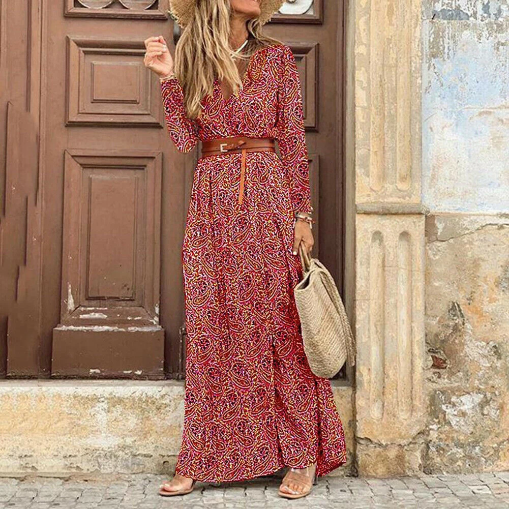 Женское длинное платье в стиле бохо; Женские вечерние платья; Летний Пляжный сарафан; Осеннее платье с глубоким v-образным вырезом и коротким рукавом