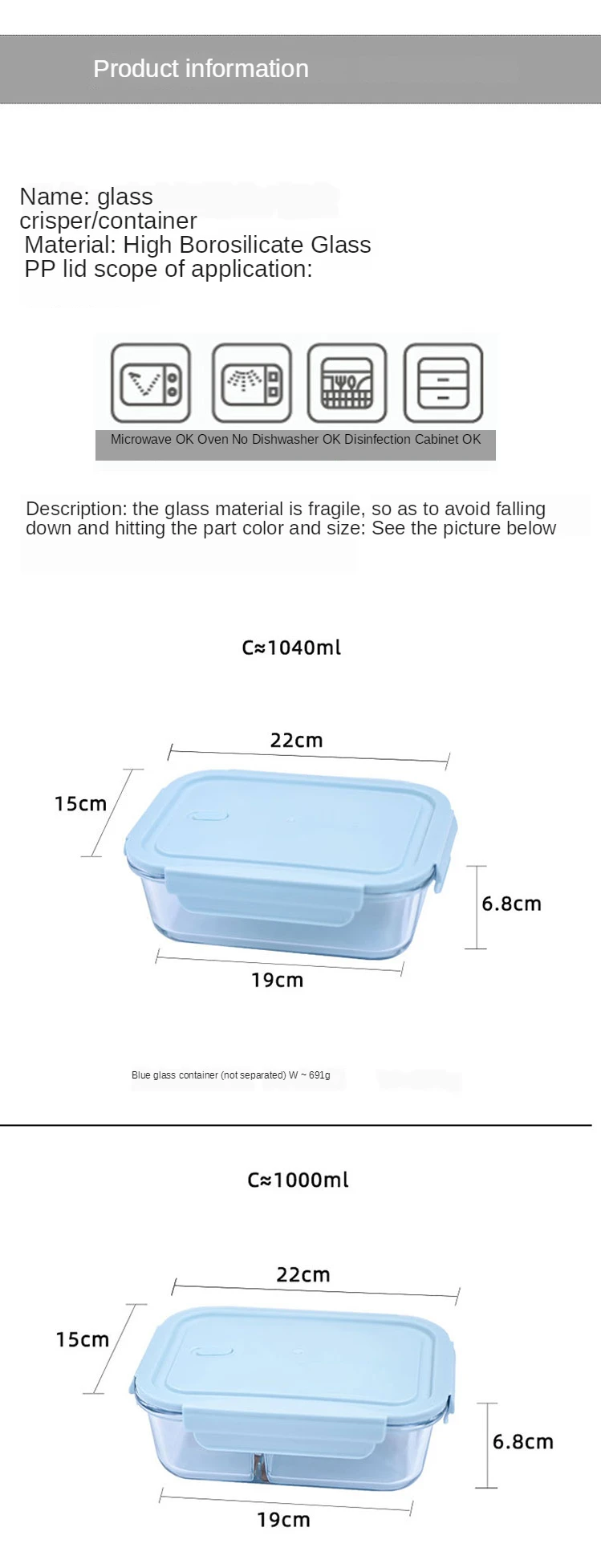 Название продукта: стеклянный Ланч-бокс Материал: Боросиликатное Стекло + ПП покрытие Емкость: 1000 мл Вес: 691 г Характеристики: Ланч-бокс изготовлен из высококачественного боросиликатного стекла, что очень безопасно. Может нагреваться в микроволновой печи. Может нагреваться в микроволновой печи. Когда крышка закрыта, будьте осторожны, чтобы не закрывать крышку. Когда крышка плотно закрыта, Ланч-бокс запечатан. Подходит, в дополнение к производству ланч-боксов, мы можем использовать больше в качестве контейнеров для хранения холодильников, которые являются чистыми И гигиеничными. Есть два стиля разделения и без разделения коробки для завтрака для вас на выбор, и есть три цвета, которые можно использовать вместе.