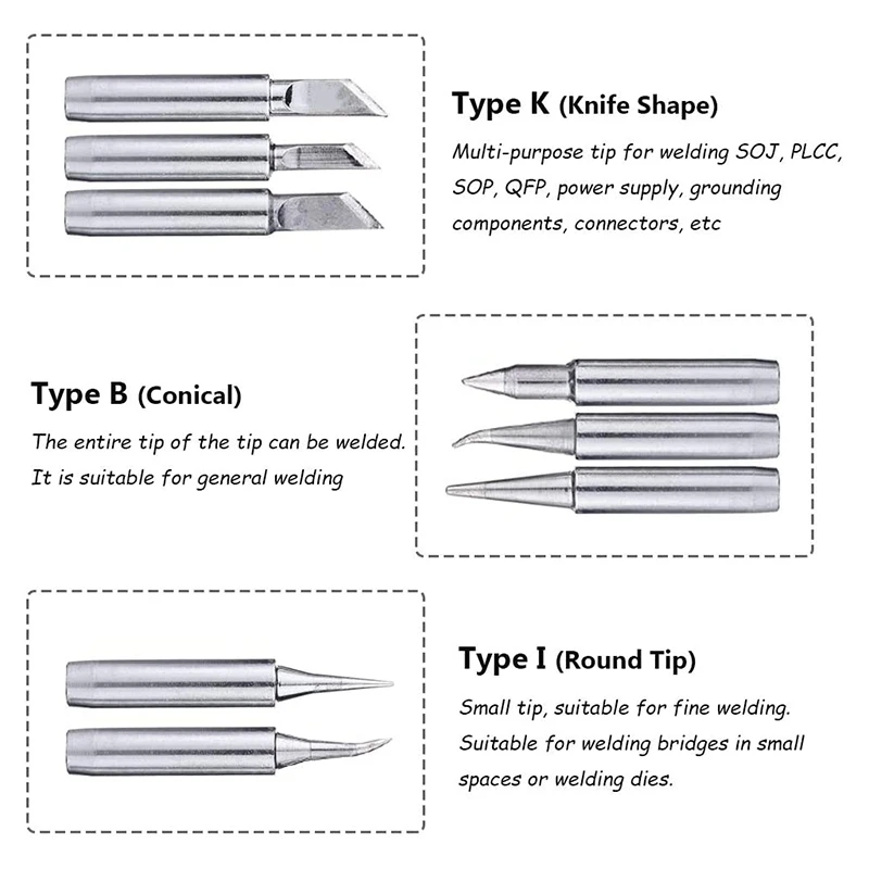 Простота использования, Быстрое нагревание благодаря медному основанию, хорошая способность подвешивать олово, не окисляется. Подходит для станций паяльника 936, 937, 938, 969, 900M, 8586, 852D.