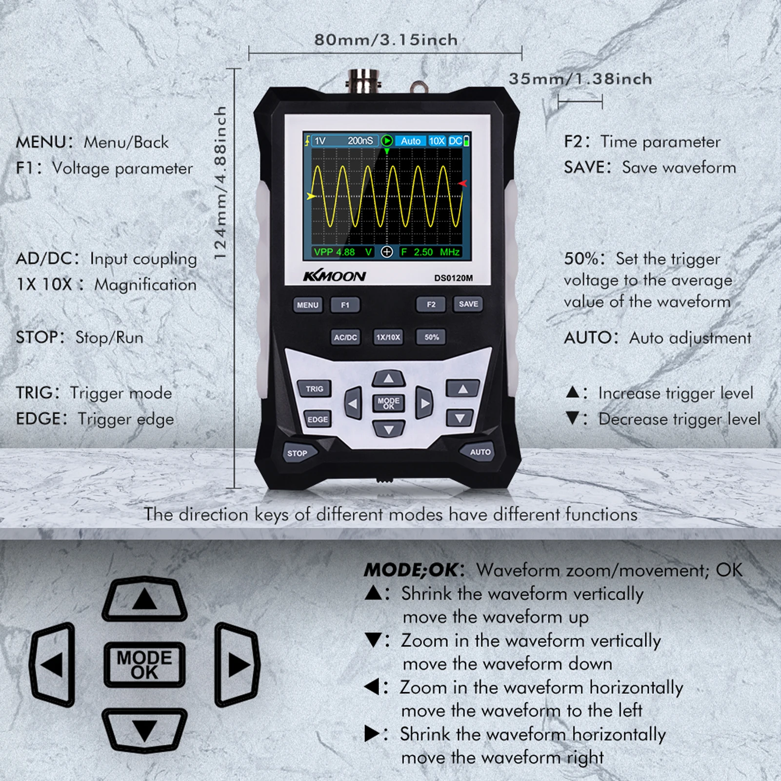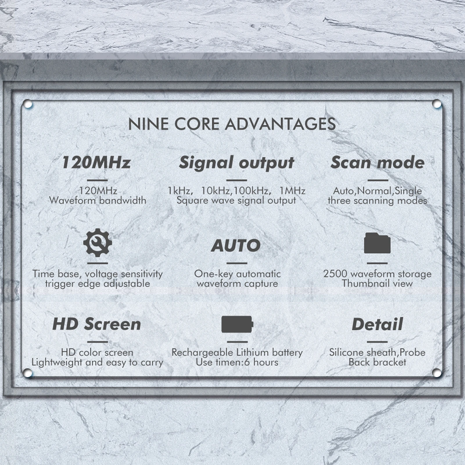 Functions: one ke-y oscilloscope, three scan modes: auto, normal and single, 12 kinds of test data, can store 2500 waveforms, support thumbnail browsing.