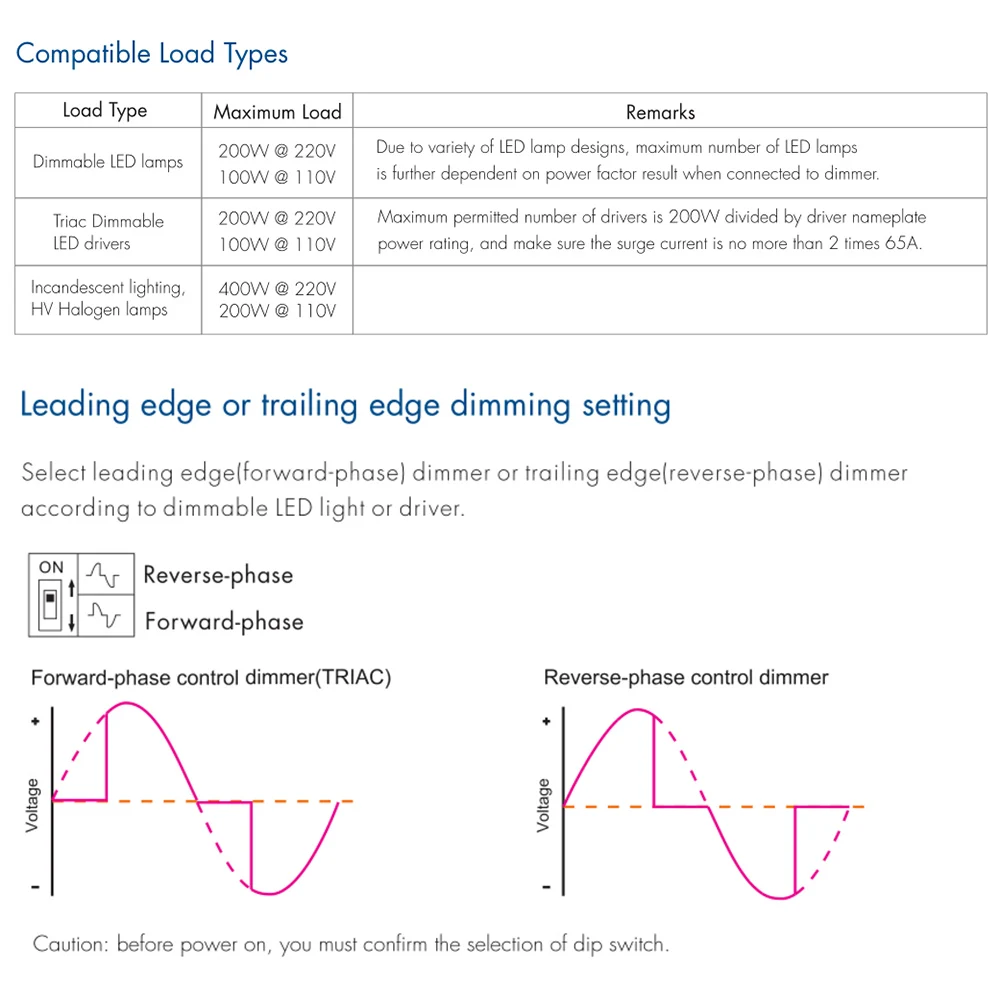 Примечание:При вычислении максимального количества Нагрузочных ламп или драйверов необходимо использовать входную мощность или входные текущие параметры одной лампы или драйвера, параметры выходной мощности нельзя использовать. Кроме того, максимальный импульсный ток диммера 65A, Сумма импульсный ток нескольких затемнения светодиодный драйверы не должна превышать 2 раза. В противном случае продукт будет перегружен и поврежден.