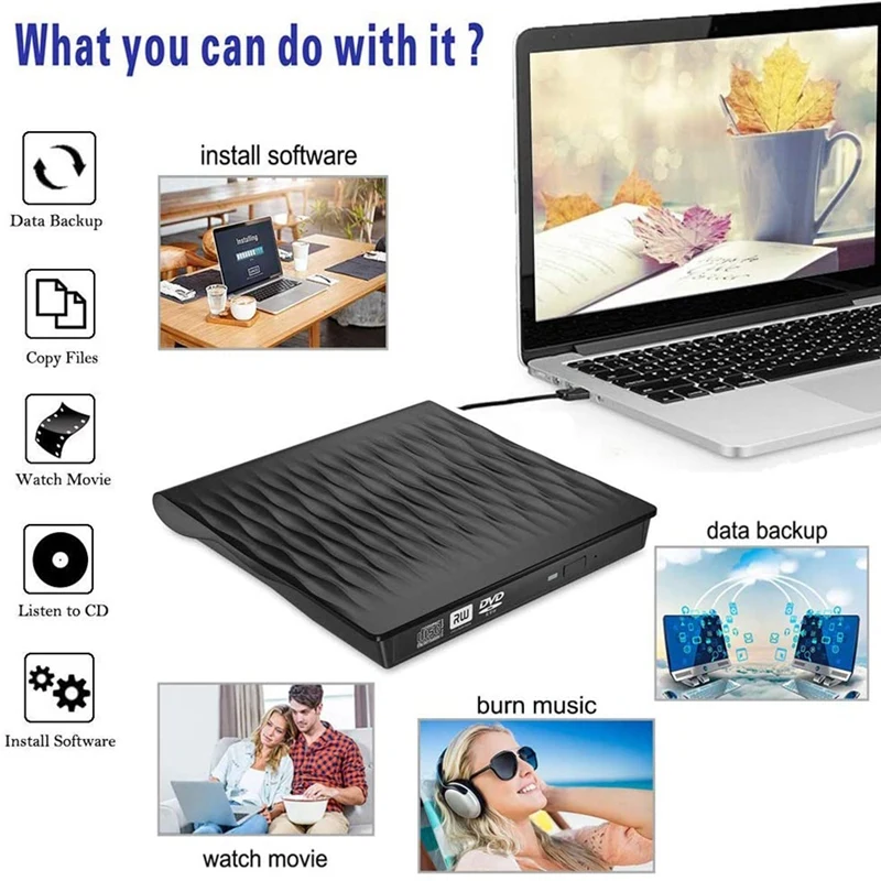 Модный дизайн внешнего вида: встроенный дизайн кабеля, простой и светильник, легко хранить, легко носить с собой. Волнистый внешний вид приносит текстуру и визуальное удовольствие. Ультратонкий дизайн, вы можете поместить этот внешний CD диск в дорожную сумку, в то время как мы путешествуем, мы также можем наслаждаться музыкой в фильме и так далее.