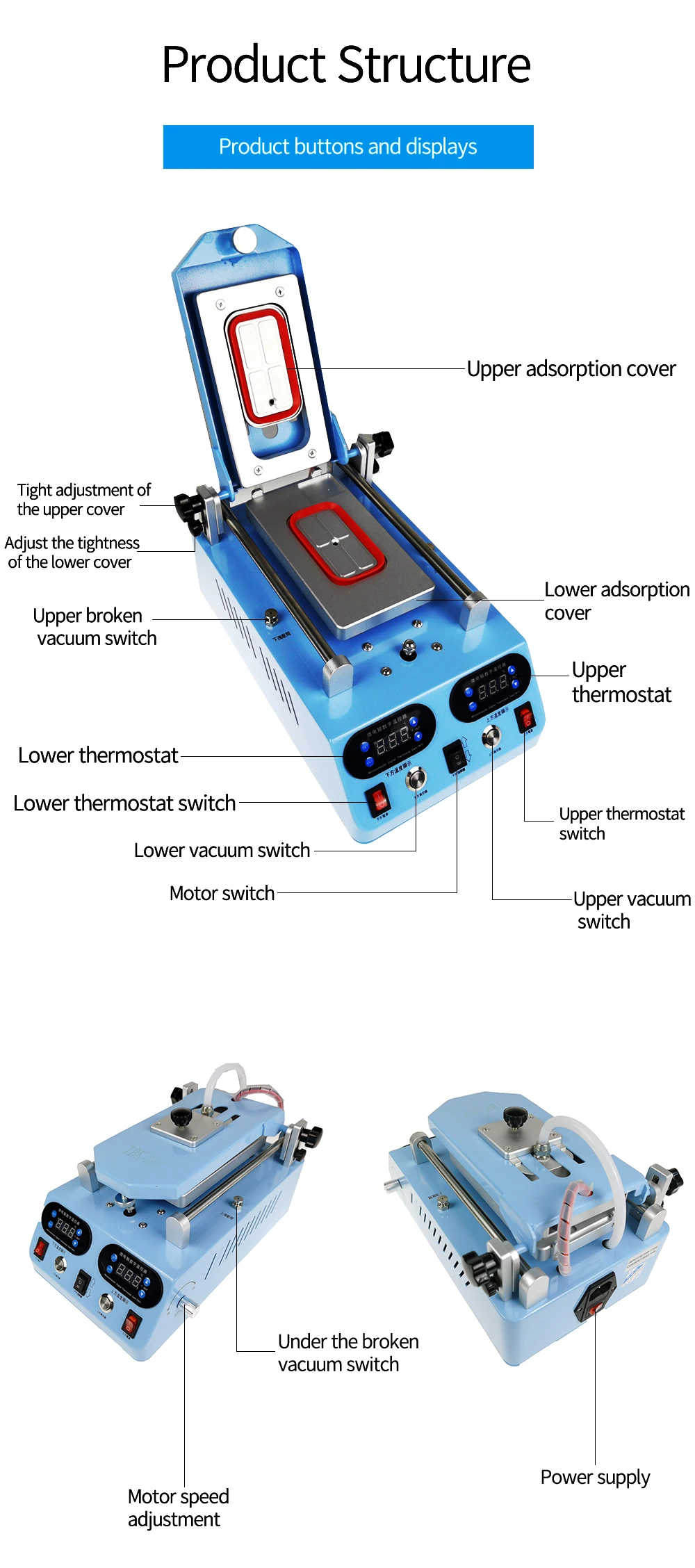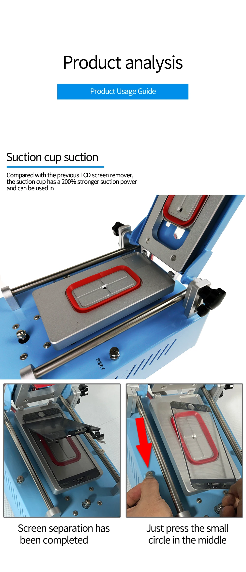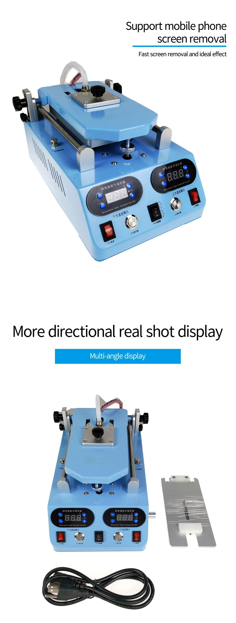 Эта машина имеет три функции: 1. Сепаратор рамы 2. Нагревательная пластина 3. Плоский ЖК-стеклянный сепаратор эта машина является популярным продуктом. Он может удалить рамку для samsung и китайский бренд мобильный телефон рамка, (только двусторонняя клейкая природа), чтобы отделить прямой экран (мощность всасывания на 200% сильнее, чем другой сепаратор), может также использоваться для ремонта ободка и удаления аккумулятора.