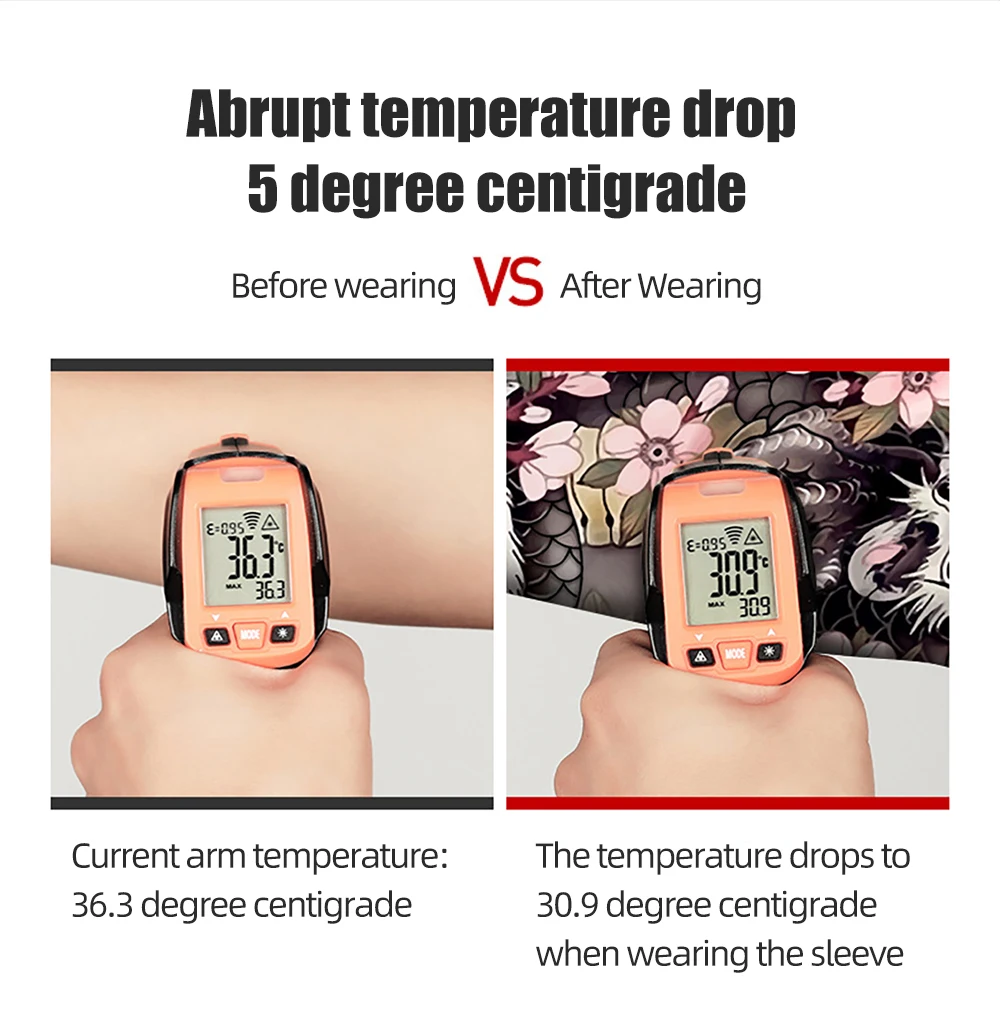 Перед ношением: текущая температура руки: 36,3 градусов по Цельсию После ношения: температура опускается до 30,9 градусов по Цельсию при ношении рукава