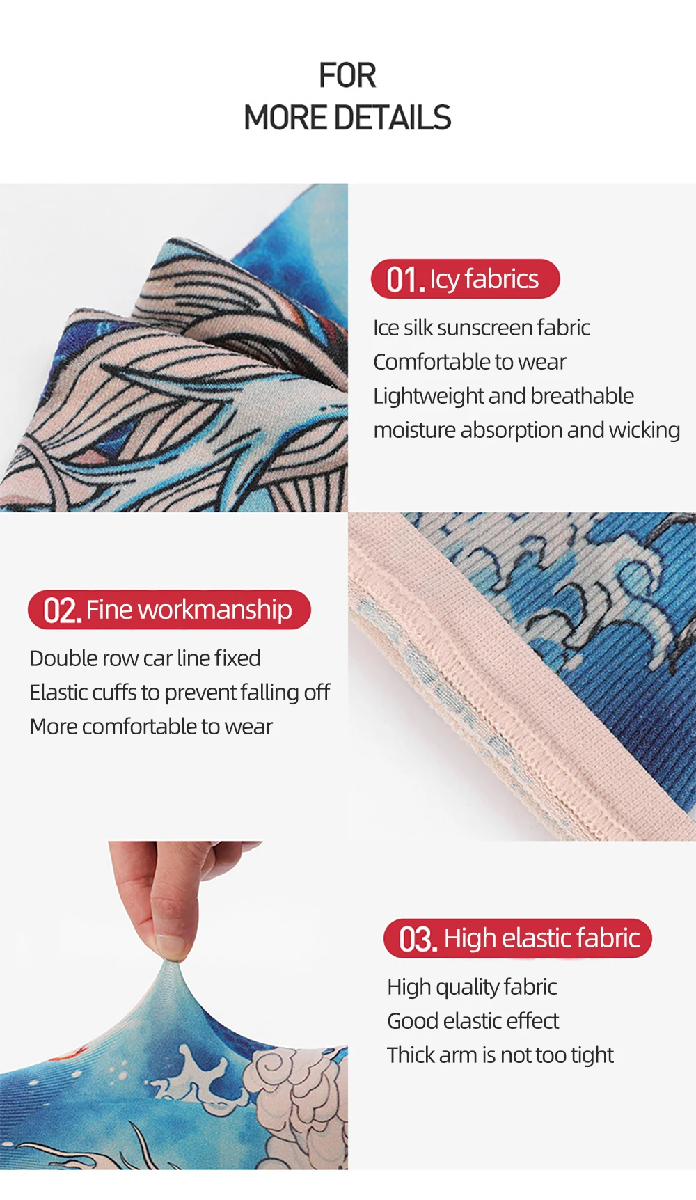 01. Ледяная ткань Солнцезащитная ткань из ледяного шелка Удобно носить Легкий и дышащий Влагопоглощение и впитывание 02 тонкая работа Двухрядная Автомобильная линия фиксированная Эластичные манжеты для предотвращения падения Удобнее носить 03 высокоэластичная ткань Высококачественная ткань Хороший эластичный эффект Толстая рука не слишком тугая