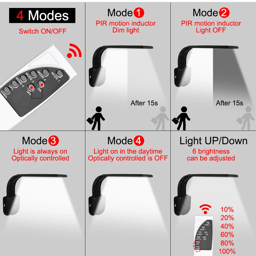[Пульт дистанционного управления и 6-уровневая регулировка яркости] Это наружное управление освещением, светодиодное пультом дистанционного управления с обнаружением 20-26 футов. Есть 6 уровней яркости, чтобы вы могли выбрать свет, как вам нравится в каждом режиме.