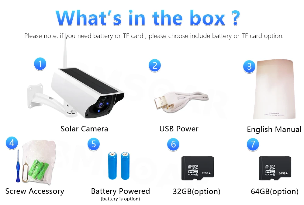 С аккумулятором Add 32G = 1шт Солнечная камера + 2шт 18650 батарея + 1шт 32G SD карта;