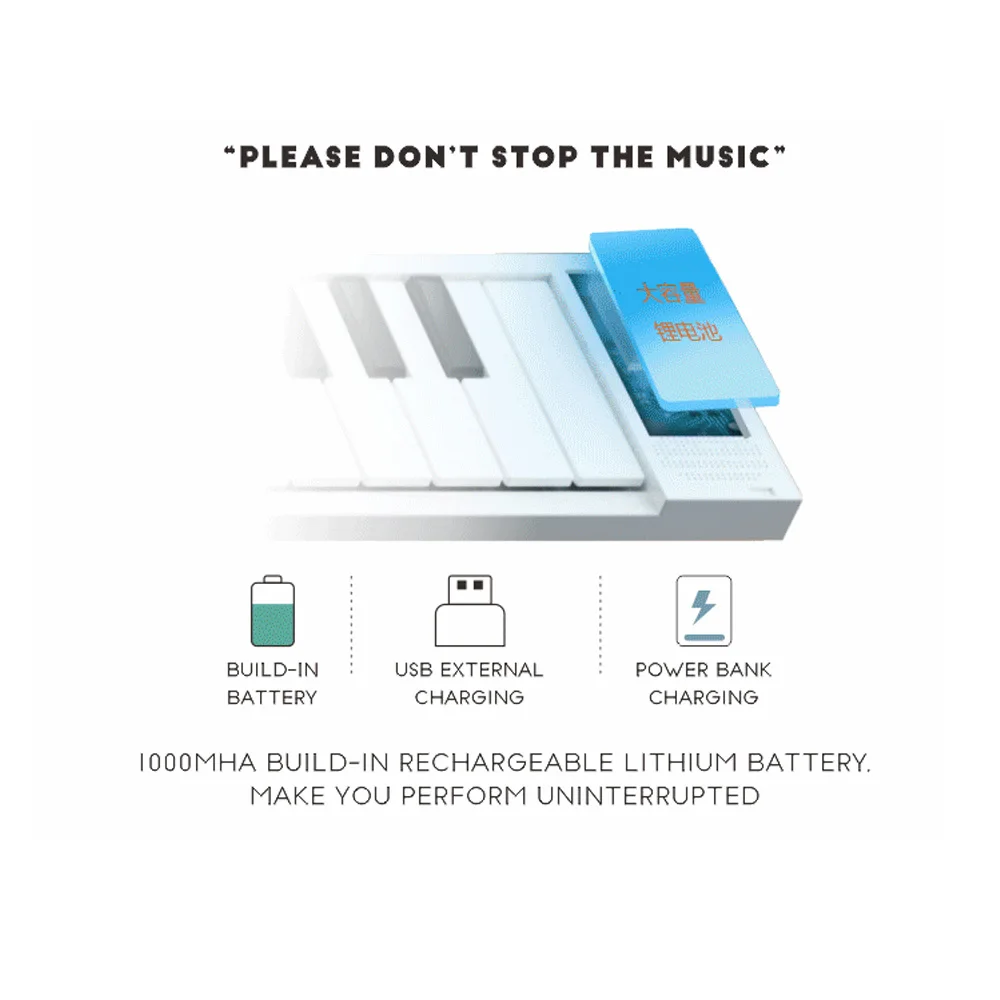 Особенности: Запатентованное складное пианино: 49 клавиш складное пианино, удобно хранить Механическая клавиатура Структура: уменьшить стандартное фортепиано ключей Размер, 0,5 см расстояние с реальным тактильным; Точный триггер каждый ключей со стабильным kick спереди и на спине, во избежание ошибочно прикосновения и поддерживает тремоло отлично. Многофункциональное электронное пианино: встроенный 128 тонов, 128 ритмов, 30 демонстрационных песен и 6 предустановленных метрономов, две колонки 2 Вт, поддерживает регулятор громкости и аудиовыход, идеально подходит для всех, от начинающих до мастеров, детей до взрослых. Встроенная перезаряжаемая литиевая батарея: Встроенный литиевый аккумулятор большой емкости 1000 мАч, долгое время использования и может быть перезаряжен входящим в комплект usb-кабелем для зарядки, что делает вашу производительность бесперебойной. Наушников Выход & сустейн-педаль Интерфейс: с 3,5 мм для наушников Выход, вы можете подключить наушники для того, чтобы наслаждаться музыкой, не беспокойтесь в ночное время суток; Поддерживает сустейн-педаль соединение, что делает ваше пианино более профессиональным. Характеристики: Бренд: MIDIPLUS Цвет: белый Ключи: 49 Тона: 128 Ритмы: 128 Демонстрационные песни: 30 Предустановка метронома: 6 Transpose: от-6 до + 6 Источник питания: Встроенный литиевый аккумулятор/USB кабель Мощность: USB 5 В Вес изделия: 1000 г Упаковка: 1 * пианино 1 * USB кабель 1 * Руководство пользователя (китайский)