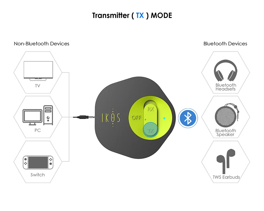 【 2 в 1 bluetooth-передатчики и приемники 】обновленный bluetooth-адаптер может использоваться в качестве передатчика или приемника. Передатчик Модели (TX) : Сделайте вашего не-bluetooth-телевизора, компьютер, iPod, переключатель потока аудио Bluetooth наушники/динамик через 3,5 мм AUX кабель. Режим приемника (RX): можно отправить аудио устройства Bluetooth мобильный телефон, iPad, ноутбук на устройство без Bluetooth (Проводная гарнитура, проводной динамик)