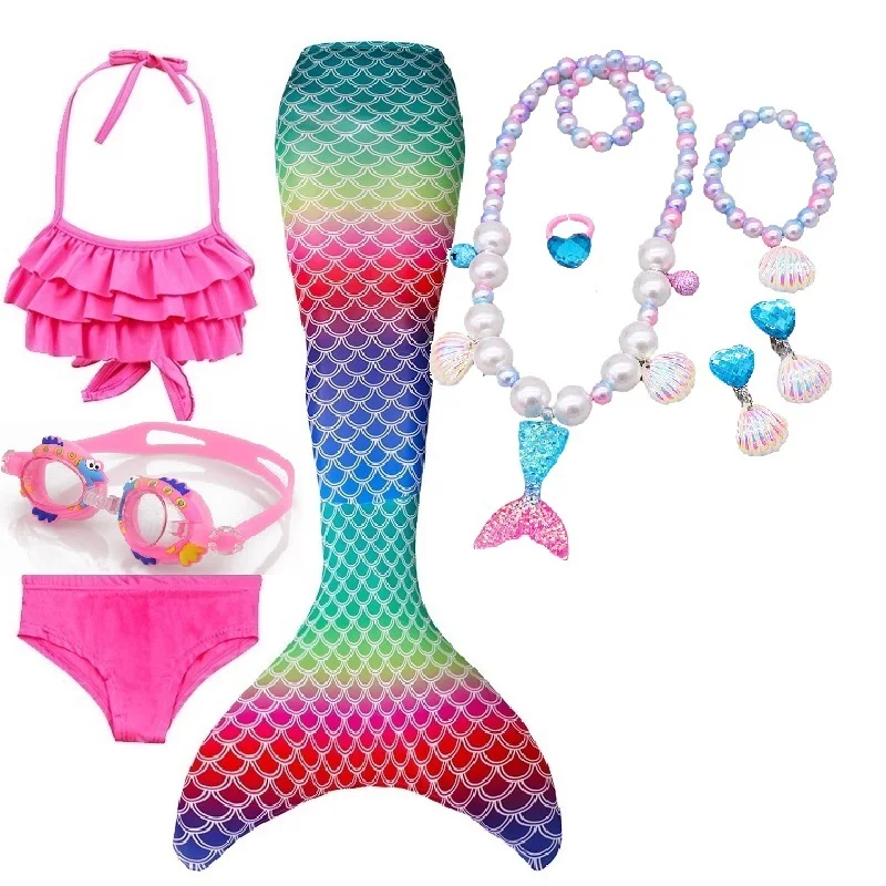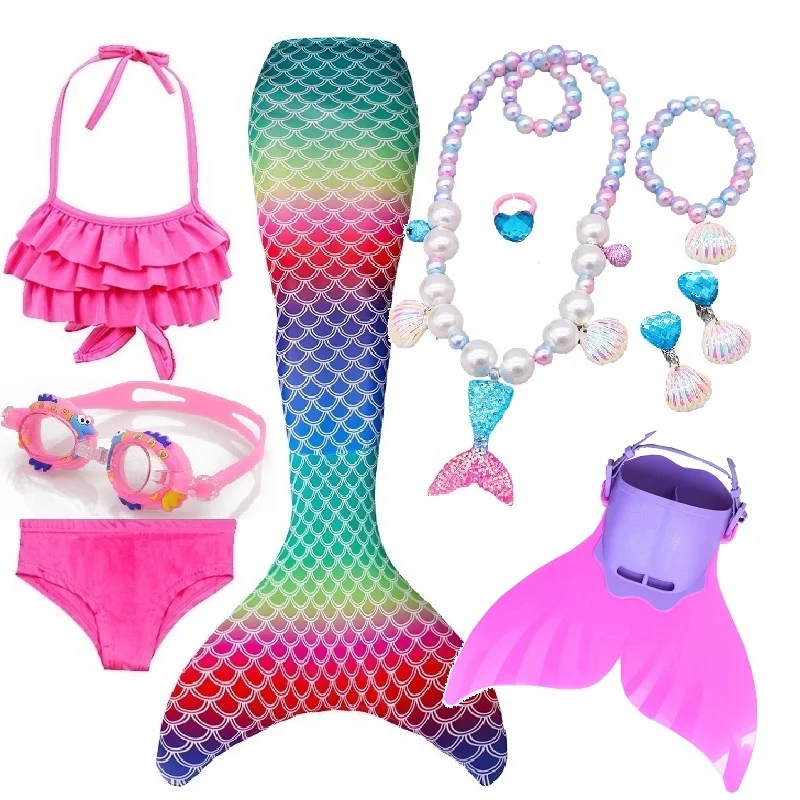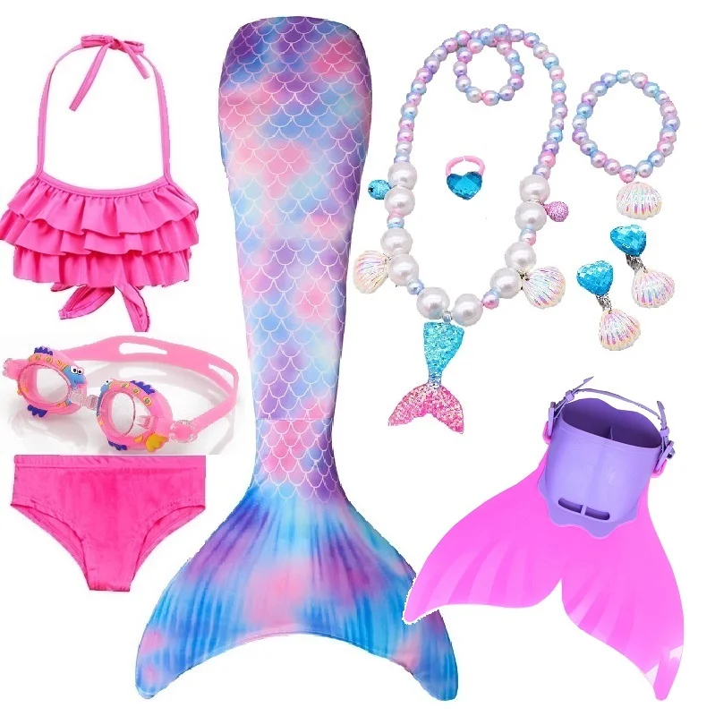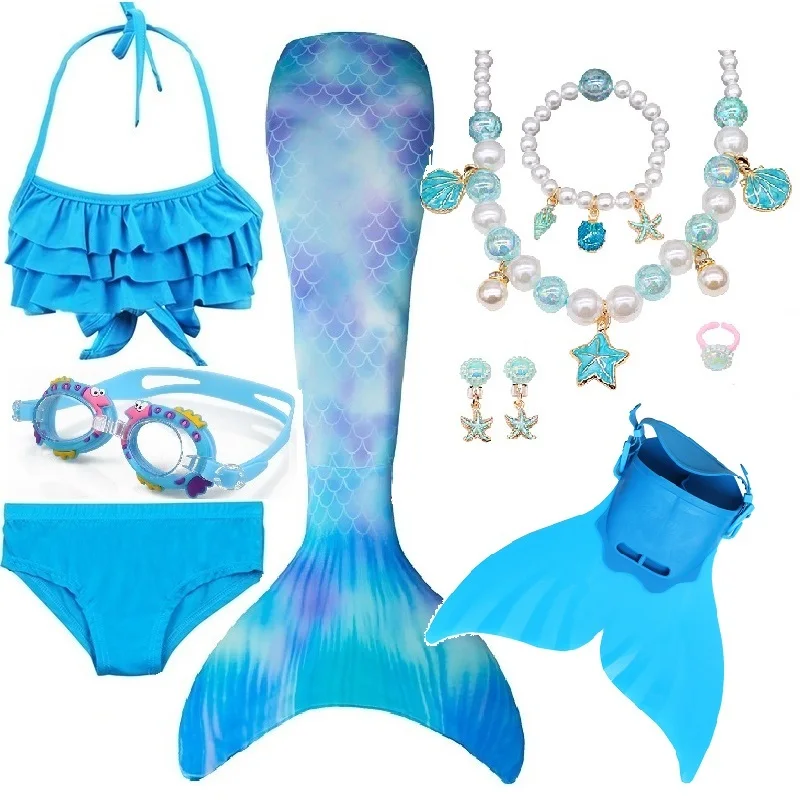 Набор 3: 1 * хвост русалки + 1 * бюстгальтер + 1 * шорты + 1 * очки + 1 * ожерелье с русалкой + 1 * кольца + 1 * браслет + 2 * серьги + 1 * плавник
