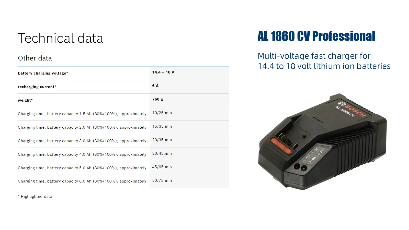 Технические данные Другие данные Напряжение зарядки аккумулятора * 14,4-18 в Ток подзарядки * 6 А Вес * 760 г Время зарядки, емкость аккумулятора 1,5 Ач (80%/100%), примерно 10/25 мин Время зарядки, емкость аккумулятора 2,0 Ач (80%/100%), примерно 15/35 мин Время зарядки, емкость аккумулятора 3,0 Ач (80%/100%), примерно 20/35 мин Время зарядки, емкость аккумулятора 4,0 Ач (80%/100%), примерно 30/45 мин Время зарядки, емкость аккумулятора 5,0 Ач (80%/100%), примерно 45/65 мин Время зарядки, емкость аккумулятора 6,0 Ач (80%/100%), примерно 50/75 мин Преимущества Универсальное быстрое зарядное устройство для литий-ионных аккумуляторов 14,4-18 в 18 в/4,0 Ач Аккумулятор может быть полностью заряжен всего за 30 минут Функция активного воздушного охлаждения продлевает срок службы батареи Благодаря профессиональной системе 18 в, совместима со всеми аккумуляторами Bosch Li-ion 14,4 и 18 в