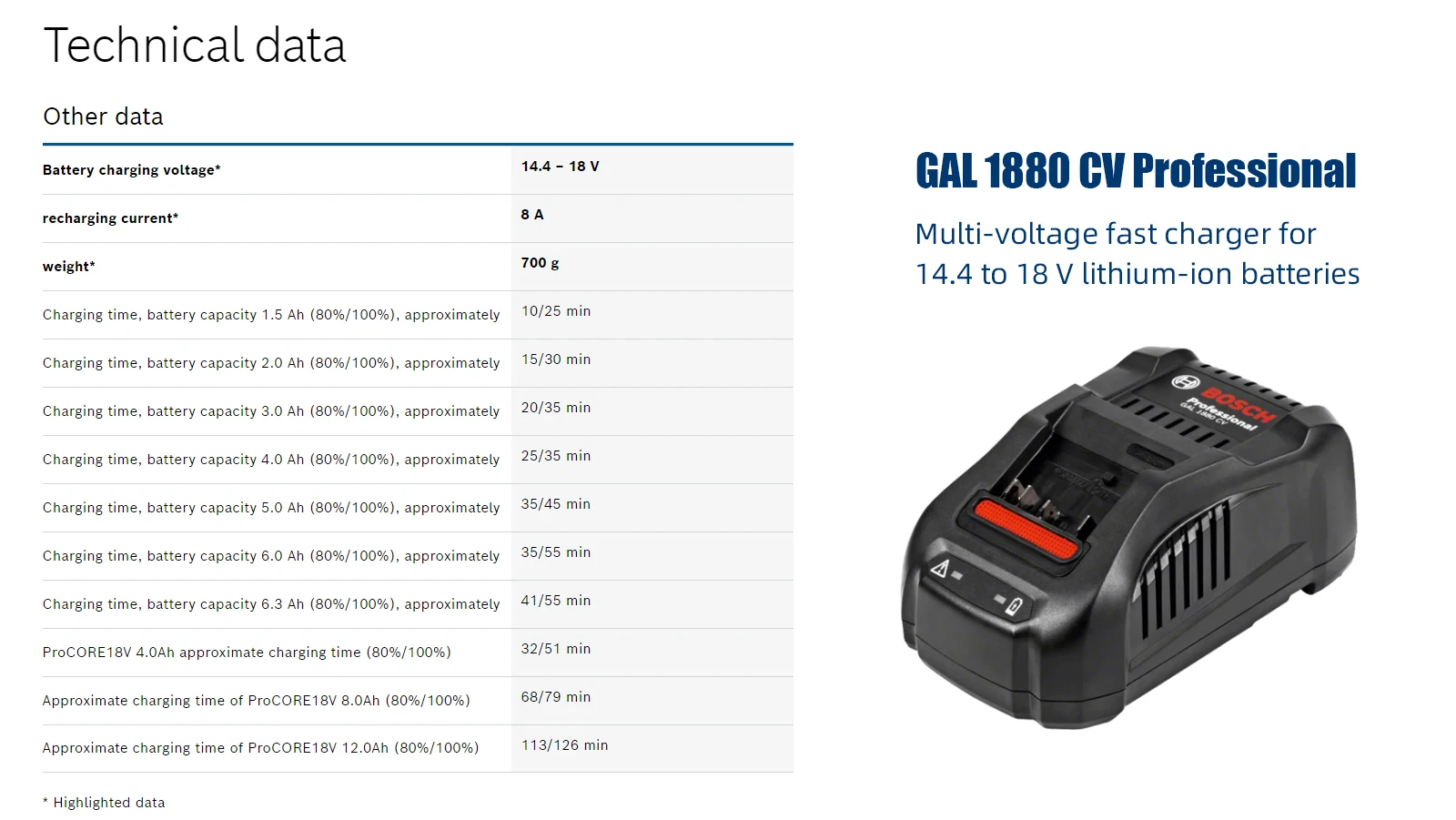 Технические данные Другие данные Напряжение зарядки аккумулятора * 14,4-18 в Ток подзарядки * 8 А Вес * 700 г Время зарядки, емкость аккумулятора 1,5 Ач (80%/100%), примерно 10/25 мин Время зарядки, емкость аккумулятора 2,0 Ач (80%/100%), примерно 15/30 мин Время зарядки, емкость аккумулятора 3,0 Ач (80%/100%), примерно 20/35 мин Время зарядки, емкость аккумулятора 4,0 Ач (80%/100%), примерно 25/35 мин Время зарядки, емкость аккумулятора 5,0 Ач (80%/100%), примерно 35/45 мин Время зарядки, емкость аккумулятора 6,0 Ач (80%/100%), примерно 35/55 мин Время зарядки, емкость аккумулятора 6,3 Ач (80%/100%), примерно 41/55 мин ProCORE18V 4.0Ah примерное время зарядки (80%/100%) 32/51 мин Примерное время зарядки ProCORE18V 8.0Ah (80%/100%) 68/79 мин Примерное время зарядки ProCORE18V 12.0Ah (80%/100%) 113/126 мин Преимущества Универсальное быстрое зарядное устройство для литий-ионных аккумуляторов 14,4-18 в Режим быстрой зарядки: через 25 минут аккумулятор 4,0 Ач можно зарядить до 80% своей емкости и находится в режиме ожидания Активное воздушное охлаждение может продлить срок службы батареи