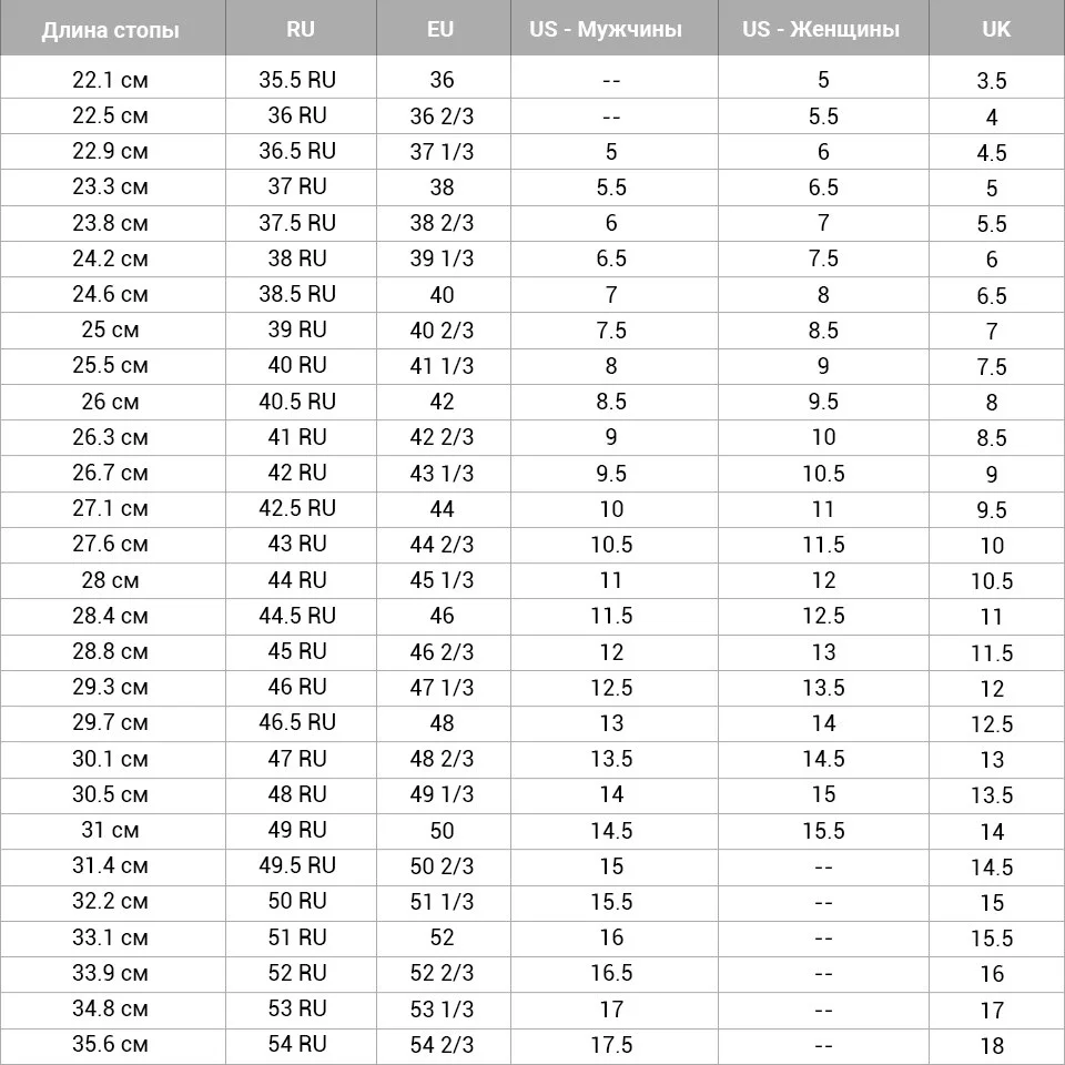 Если сверяете размер по коробке или бирке, используйте значение UK, US или FR.