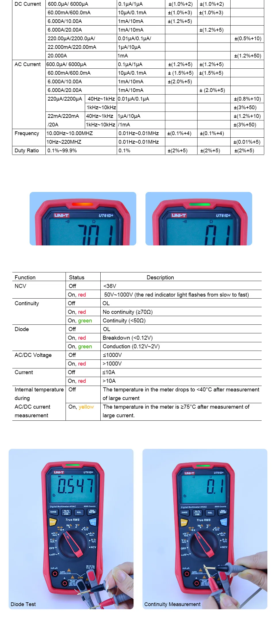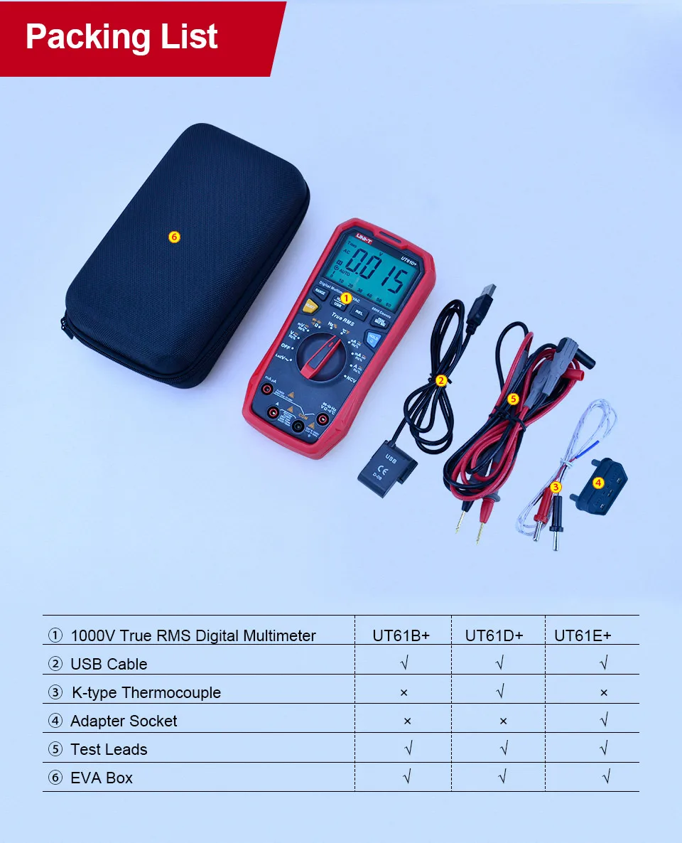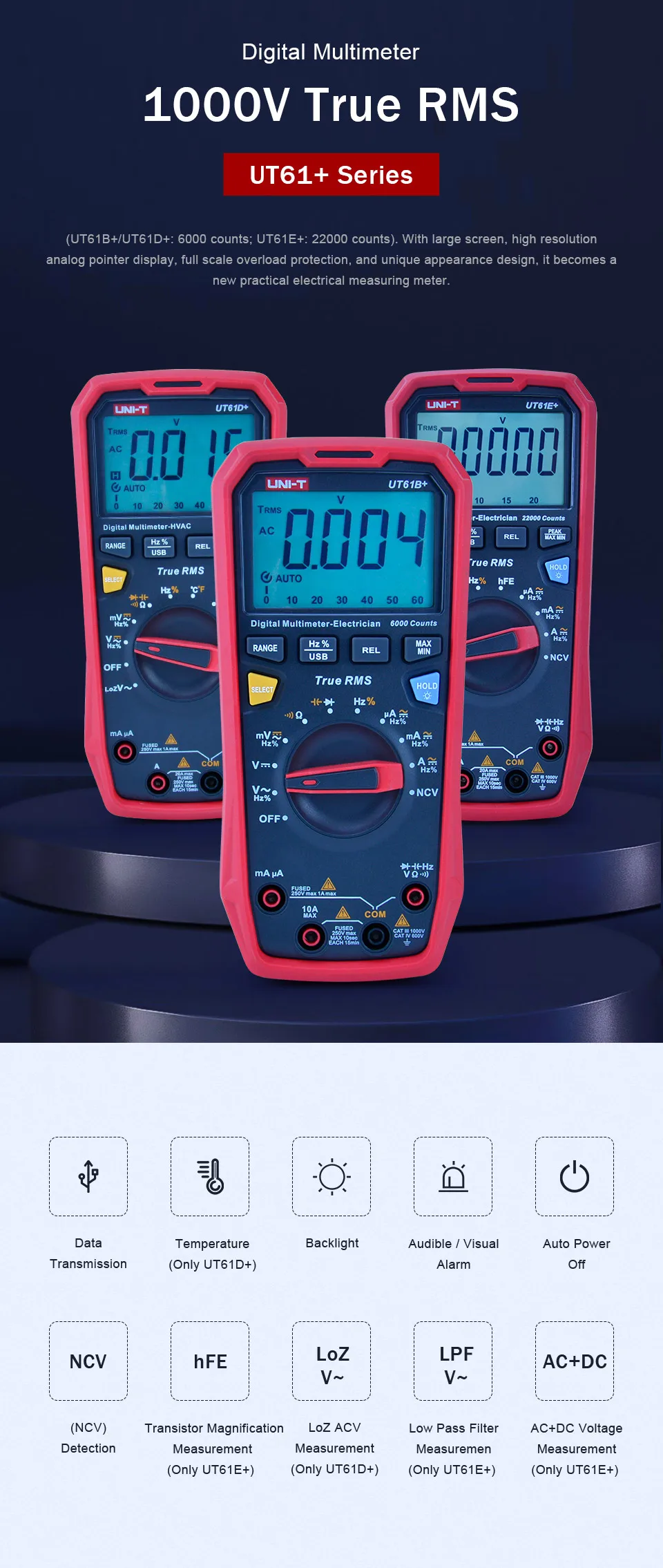 UT61E + 1000V True RMS Digital MultimeterUT61 + series-надежные цифровые мультиметры с отображением 6000 (UT61B +/D +) и 22000 (UT61E +). Он может измерять до 1000 В переменного/постоянного тока. Оснащен звуковым и видимым сигналом тревоги, эта серия может обеспечить предупреждение дополнительно при измерении высокого напряжения/тока и температуры.