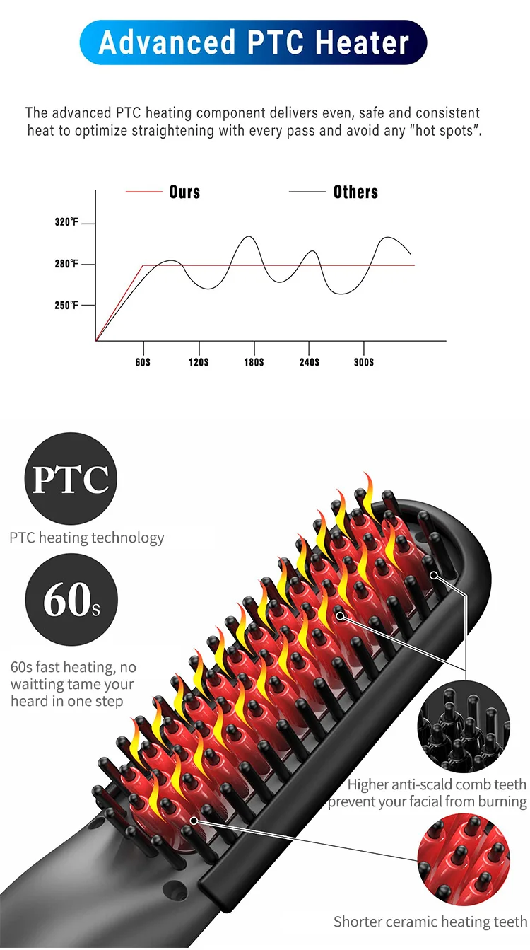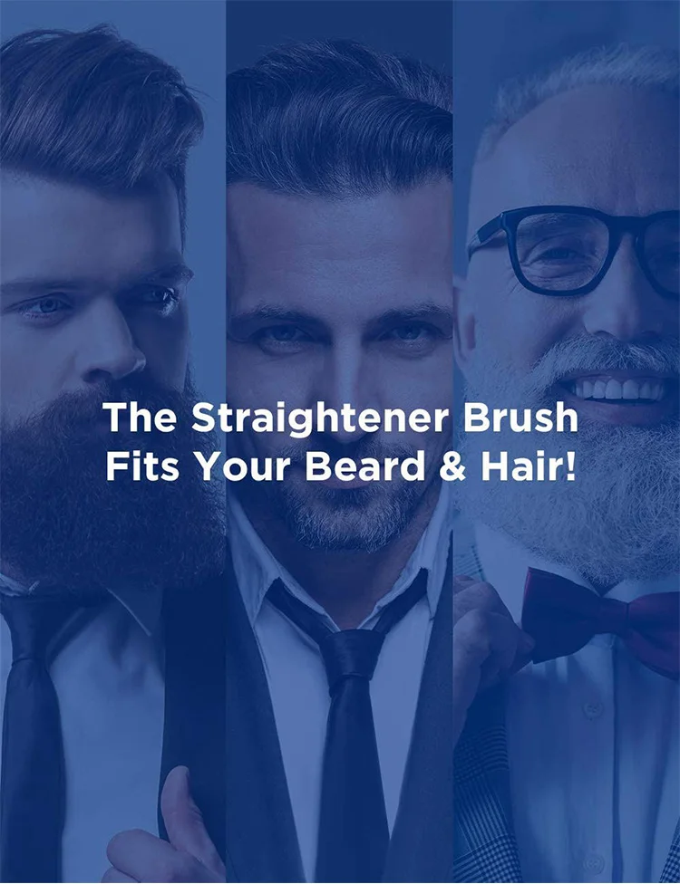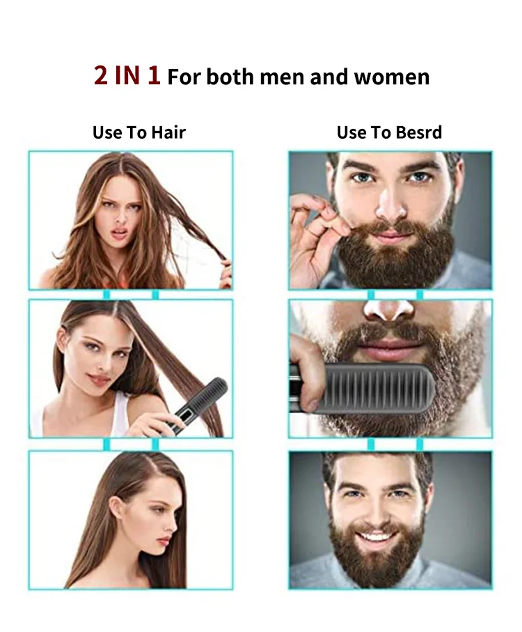 1: выпрямитель для бороды и волос 2 в 1 с эргономичным дизайном-изогнутая форма, основанная на контурах щек и головок человека, В то же время добавлена силиконовая щетка для кожи, чтобы достичь комфортного использования, избежать жжения кожи. Идеальный подарок для мужчин.