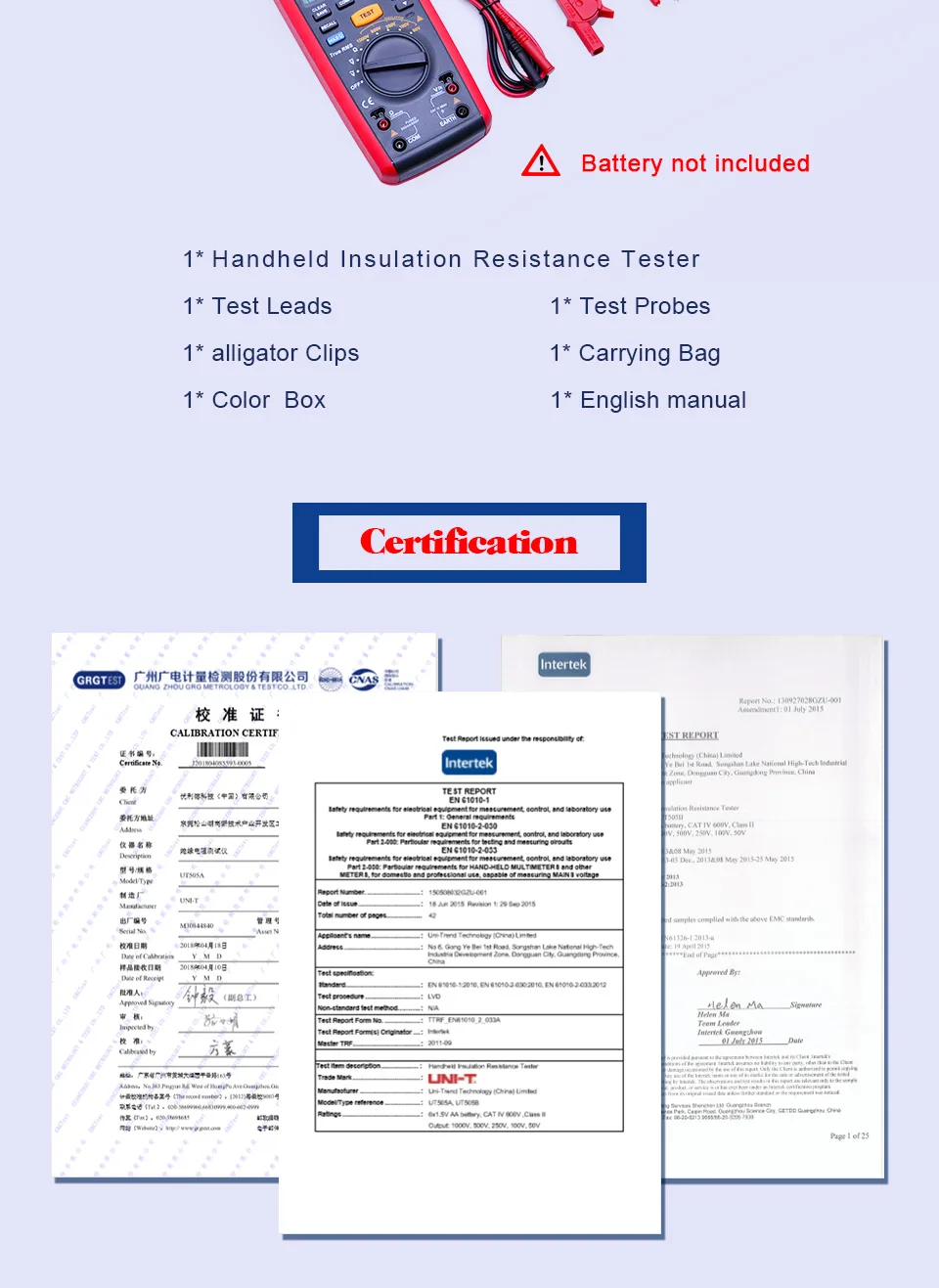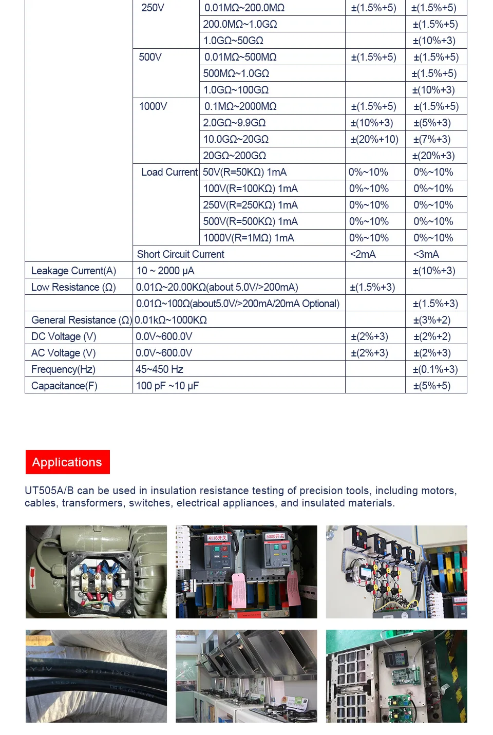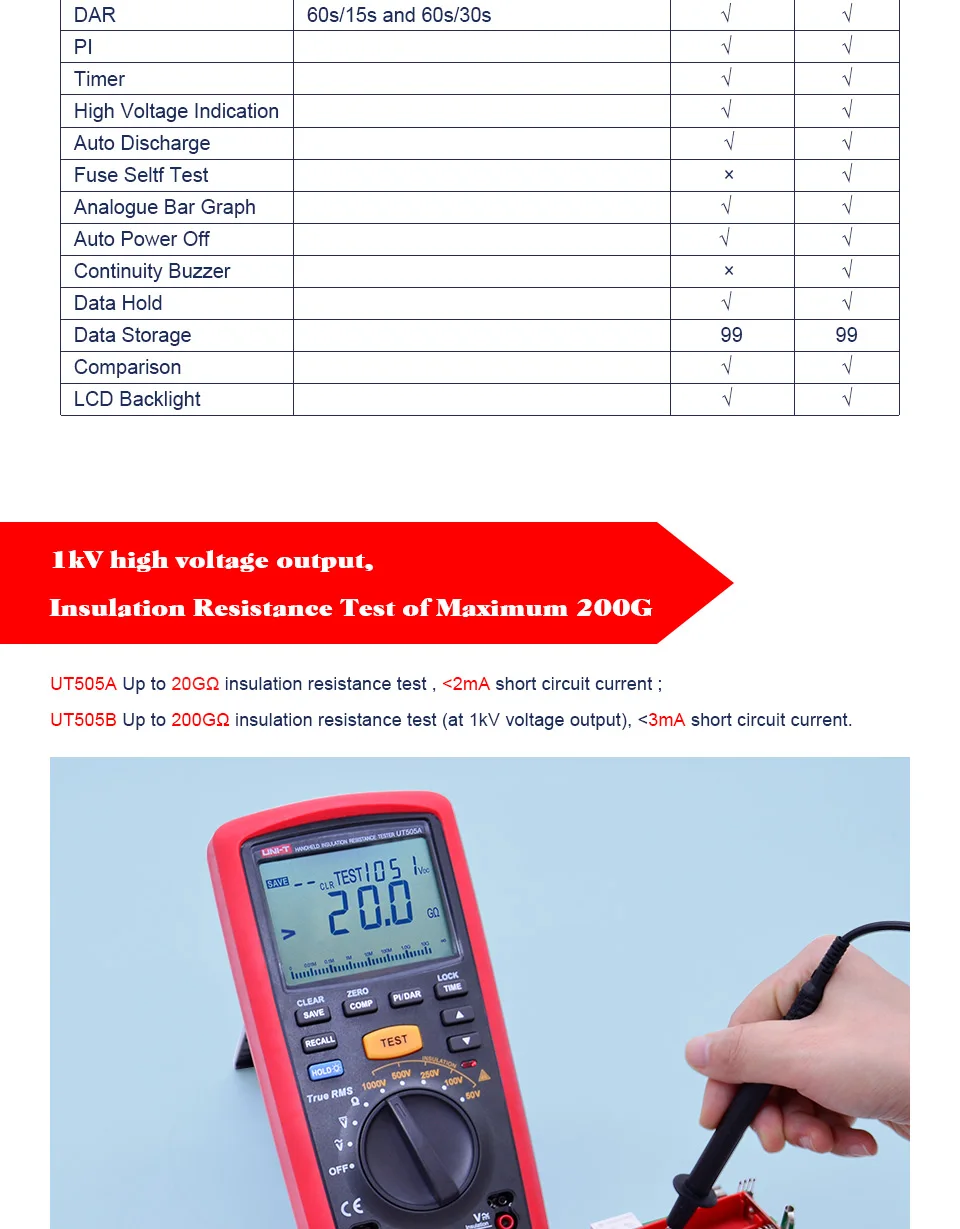 Портативный тестер сопротивления изоляции UT505A/B Серия UT505 ручной тестер сопротивления изоляции true RMS комбинированные Характеристики цифрового мультиметра и тестер сопротивления изоляции. Помимо типичных функций мультиметра, эти счетчики также могут измерять сопротивление изоляции, PI, DAR и автоматически рассчитать коэффициент сопротивления для определения состояния изоляции. Применение: UT505 может использоваться для тестирования сопротивления изоляции прецизионных инструментов, включая двигатели, кабели, трансформаторы, переключатели, электрические приборы и изоляционные материалы 1. Автоматическая мощность off 2. Подсветка ЖК-дисплея 3. Выходная сигнализация высокого напряжения 4. 99 групп хранения данных 5. Хранение данных 6. Соответствует IEC 61557: 61557-1:2007; 61557-2:2007; 61557-4:2007