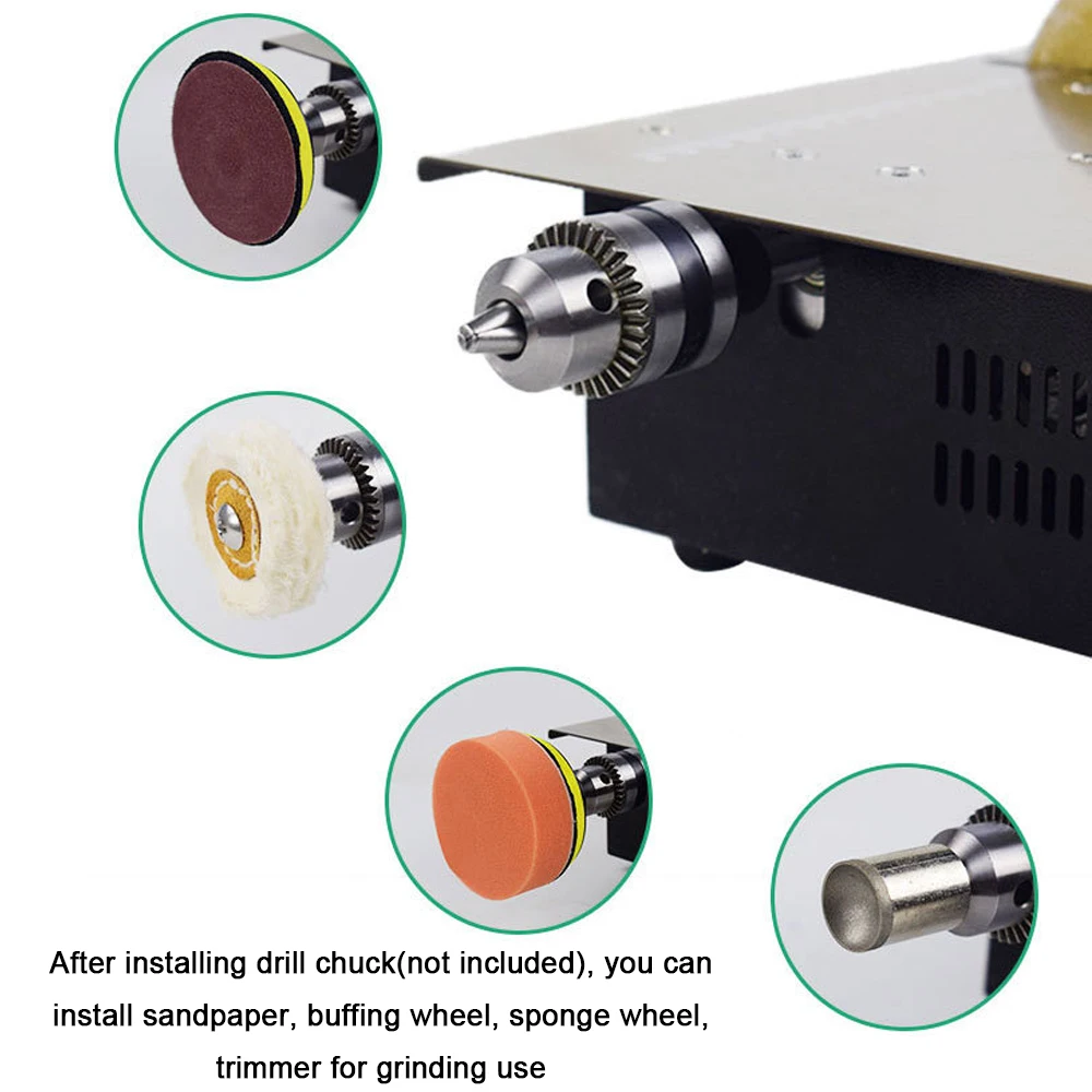 After installing drill chuck(not included), you can install sandpaper, buffing wheel, sponge wheel, trimmer for grinding use.