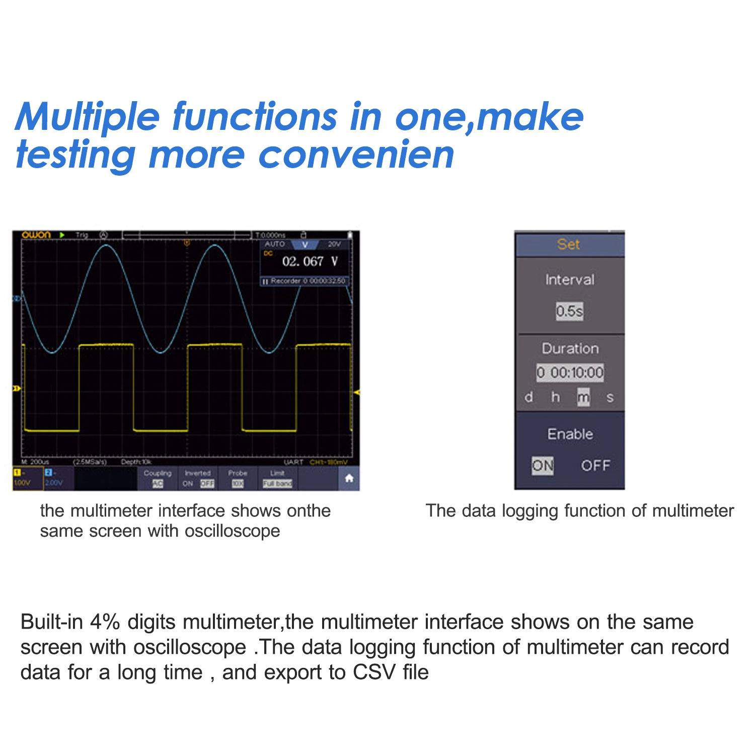 Универсальный цифровой планшетный осциллограф со встроенным мультиметром 4-1/2 цифр, который может отображать интерфейс мультиметра. Функция записи данных мультиметра может записывать данные в течение длительного времени и экспортировать в csv-файл.