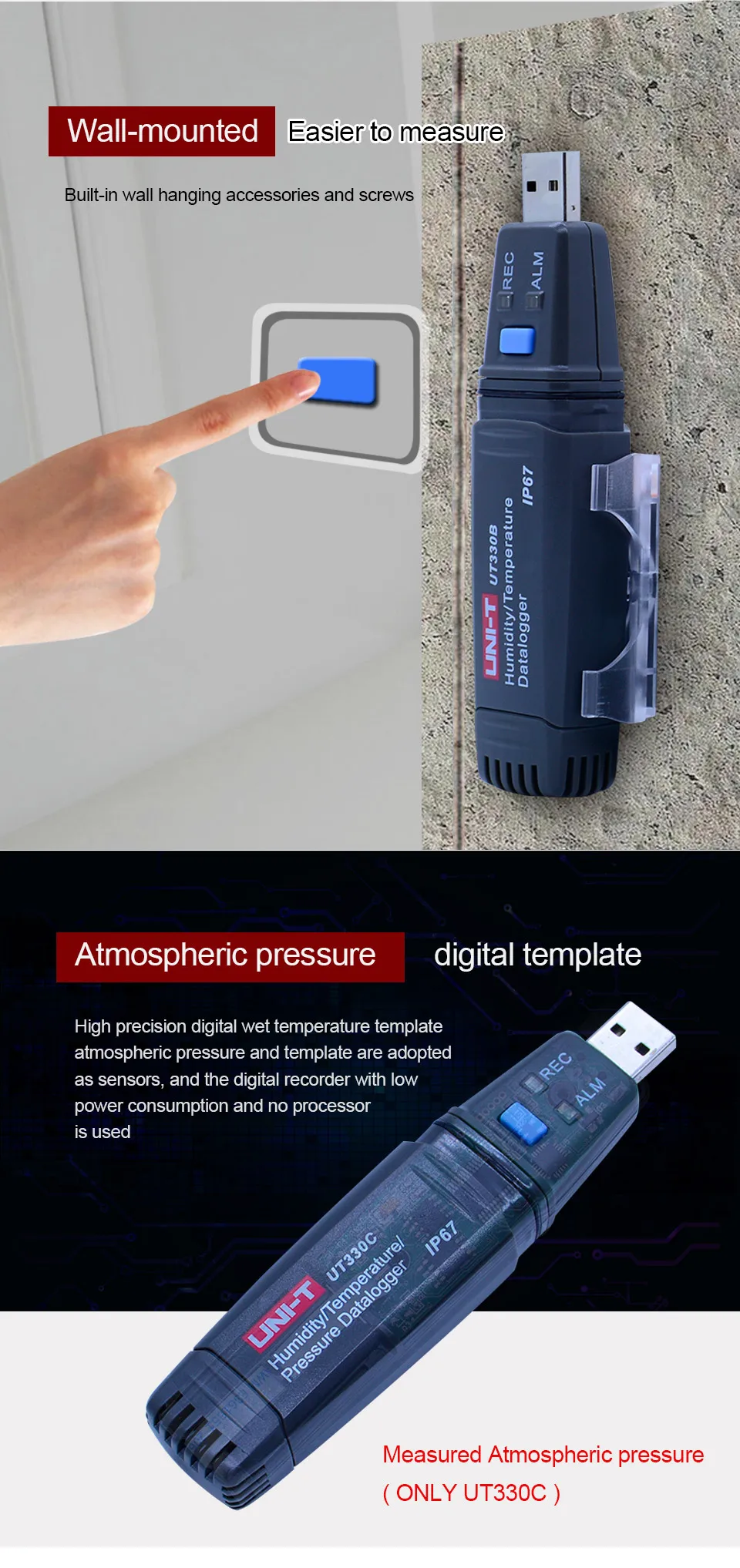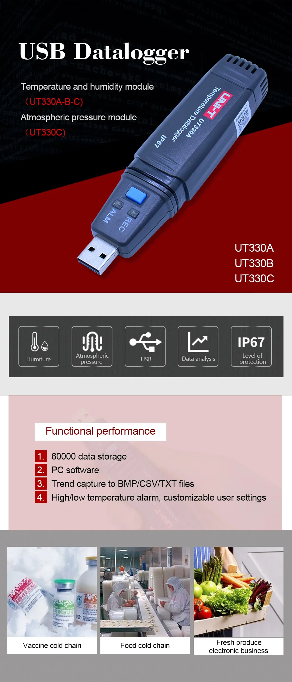 Серия UT330 представляет собой Тип цифрового регистратора данных, оснащенного высокоточной цифровой температурой, модулем влажности, модулем барометрического давления и микропроцессором с сверхнизким энергопотреблением. Функции продукта: IP67 водонепроницаемый и пыленепроницаемый, высокая точность, большая емкость для хранения, автоматическое сохранение, Передача данных USB, управление компьютером на основе изображений и статистики. Он отвечает требованиям различных высокоточных измерений и долгосрочного контроля и записи температуры, влажности и атмосферного давления. Он может применяться в медицине, транспортировке и хранении.