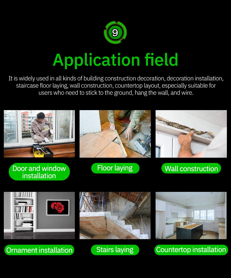 Его применение включает в себя: горизонтальный, вертикальный, поперечный Проецирование для украшения, строительство зданий, украшение дома, ремонт, установку мебели, напольное покрытие и планировку проекта.