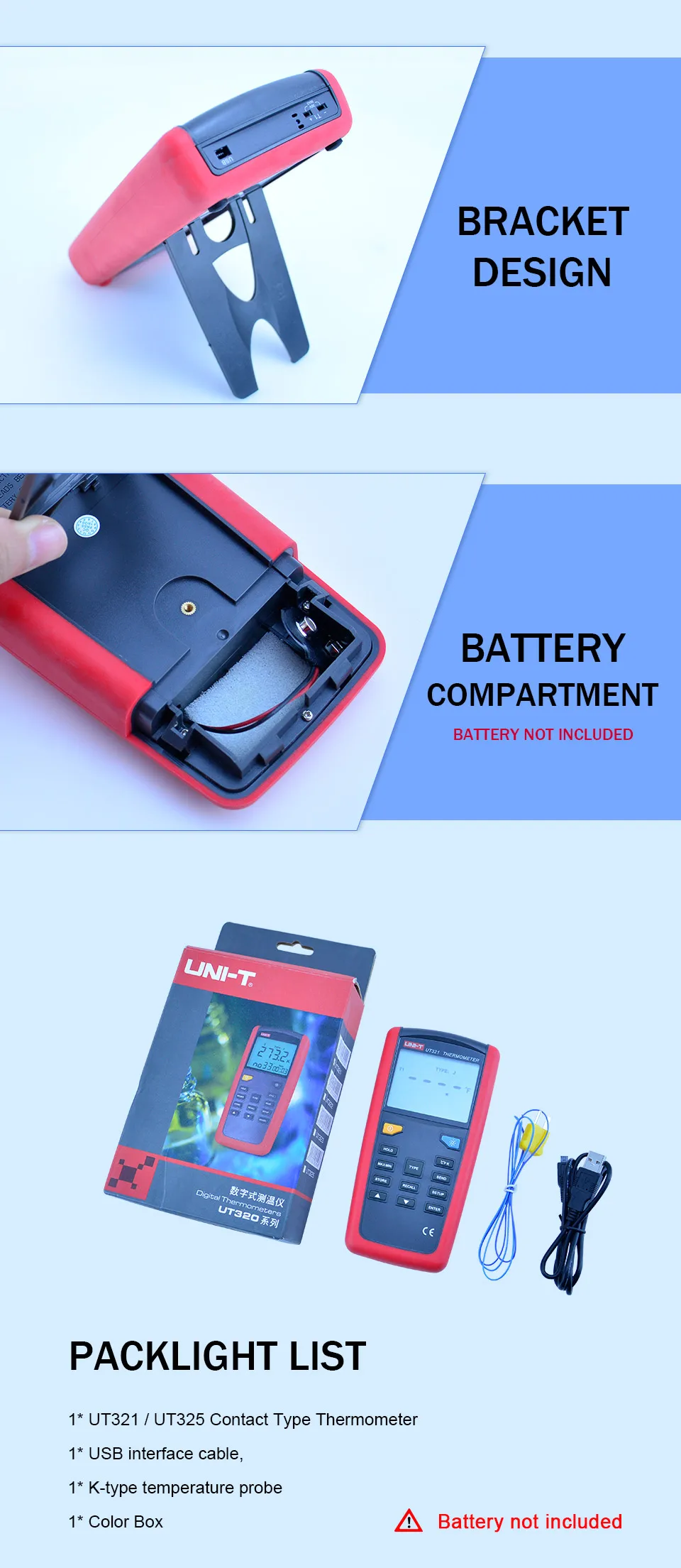 Упаковочный лист:1 * термометр контактного типа 1 * Датчик температуры k-типа, 1 * кабель интерфейса USB, 1 * коробка Golor,